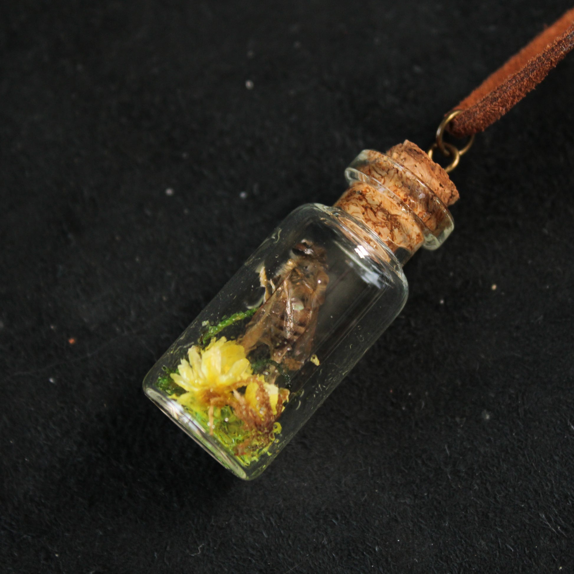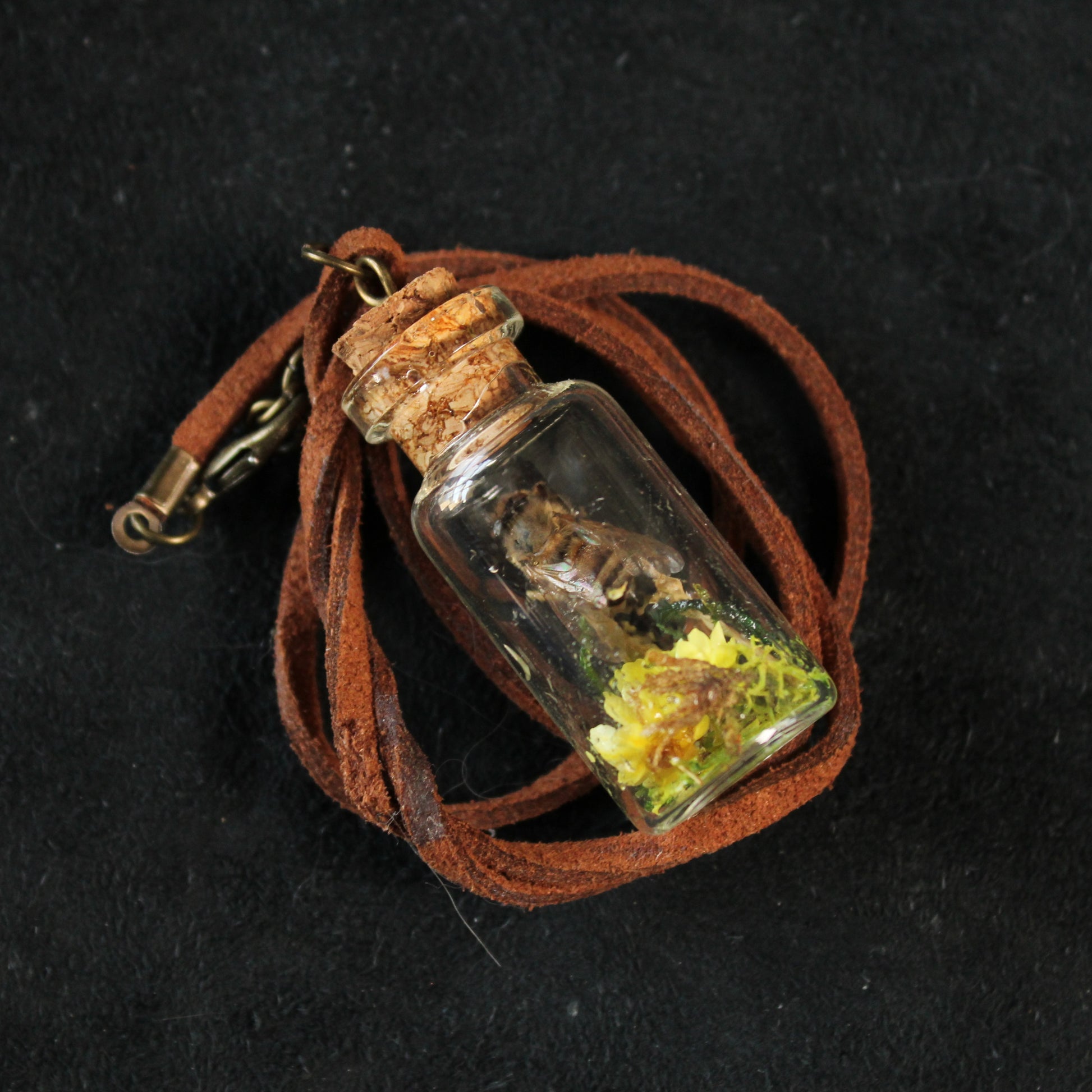 This small bottle necklace contains a real bee carefully arranged upon a bed of moss and yellow flowers. The necklace hangs on a 20in brown cord.