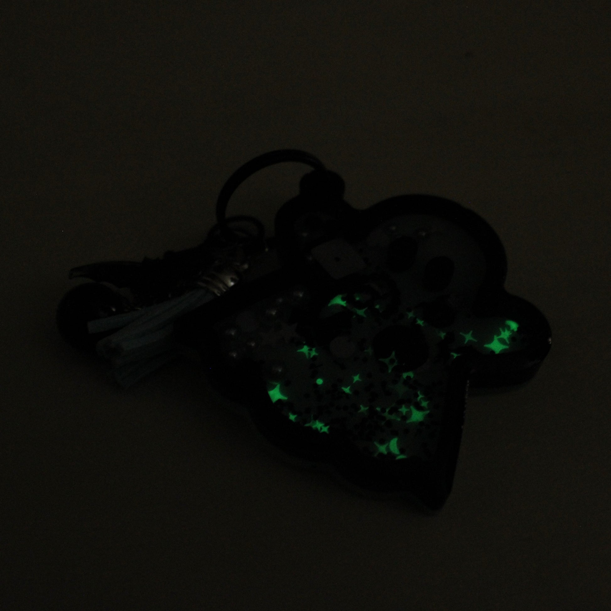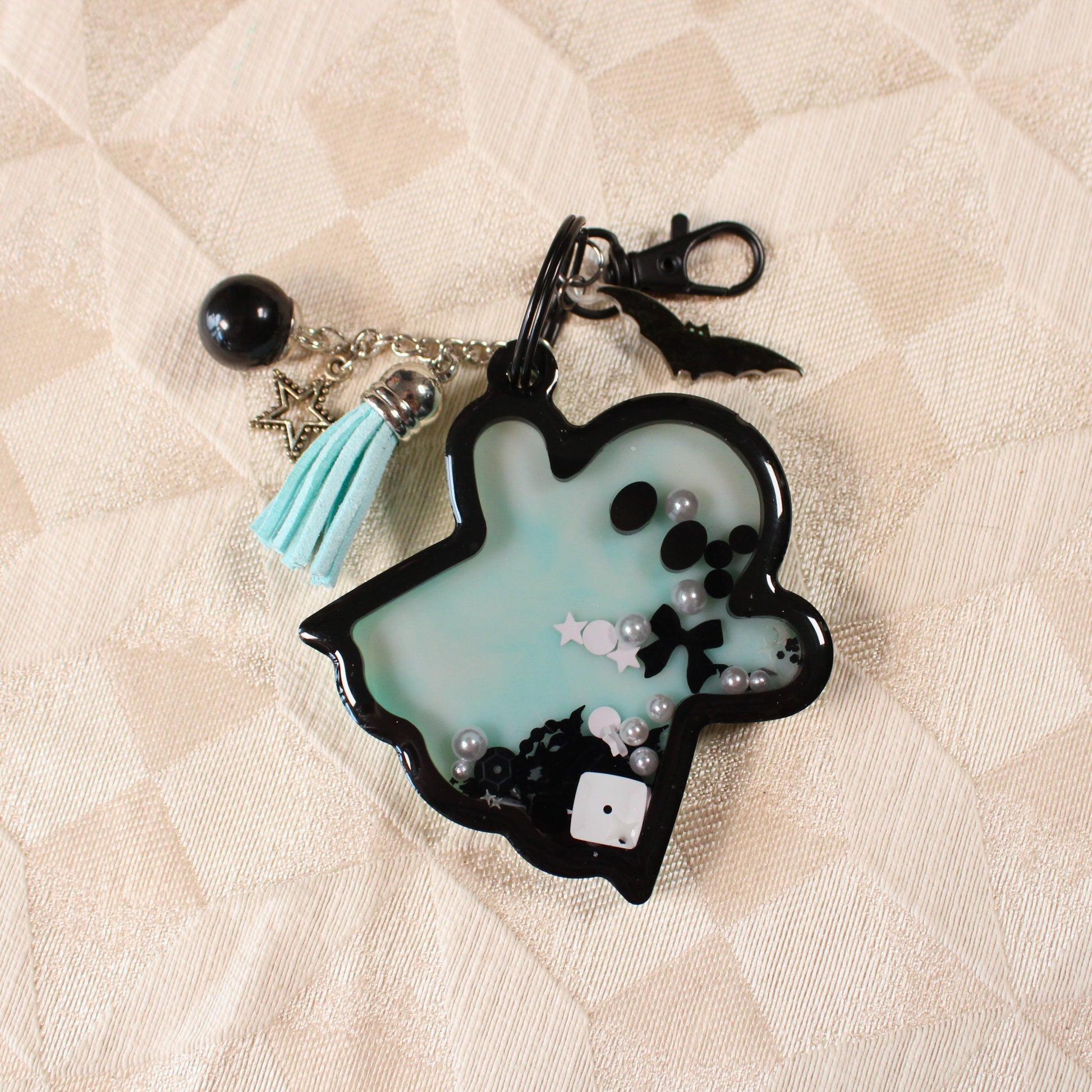 A handmade, resin, shaker-charm keychain in the shape of a ghost. Inside the ghost are free-moving beads, glitter, sequins, charms, and polymer clay sprinkles suspended in oil. The keychain comes with a variety of extra charms to add to the overall spooky and whimsical vibe.