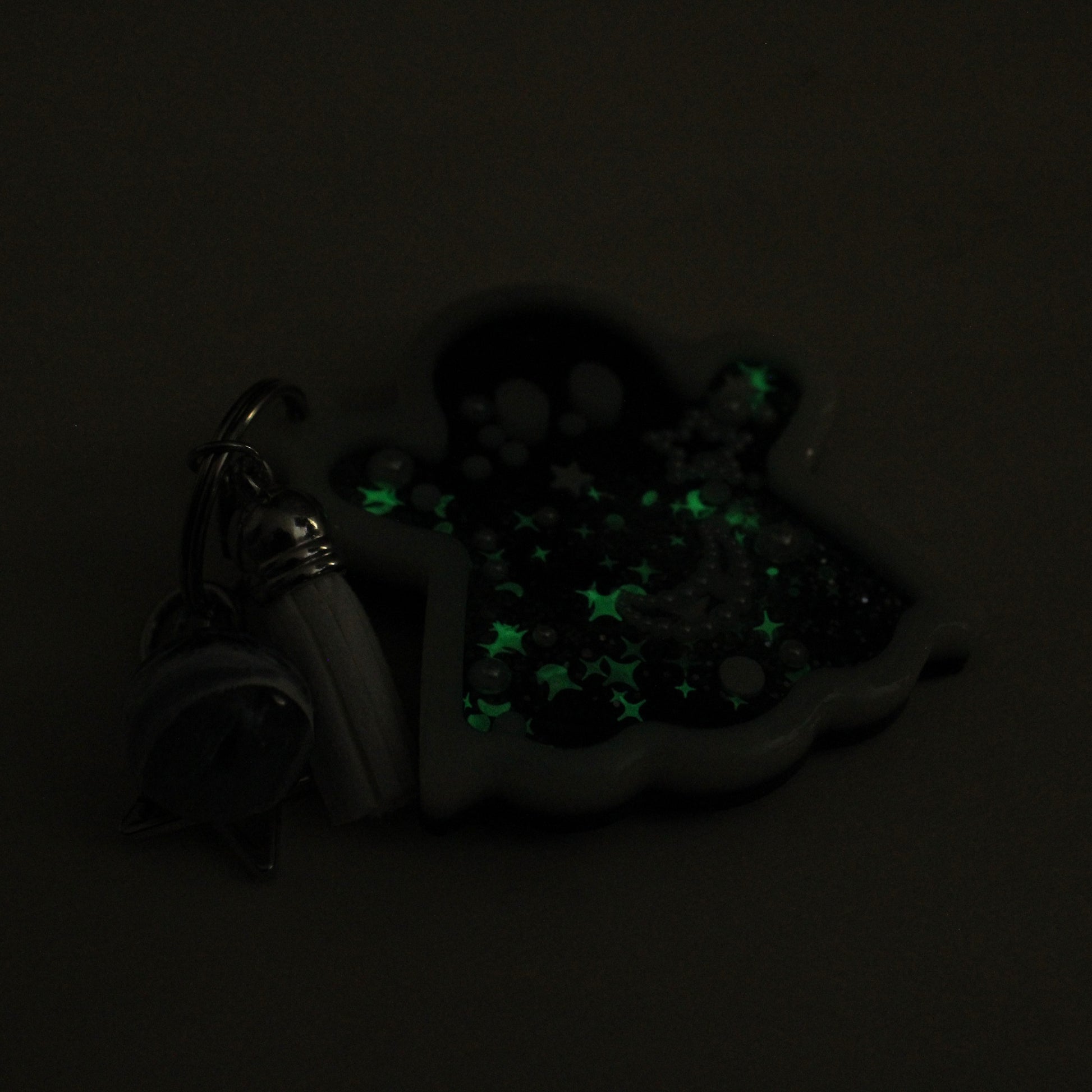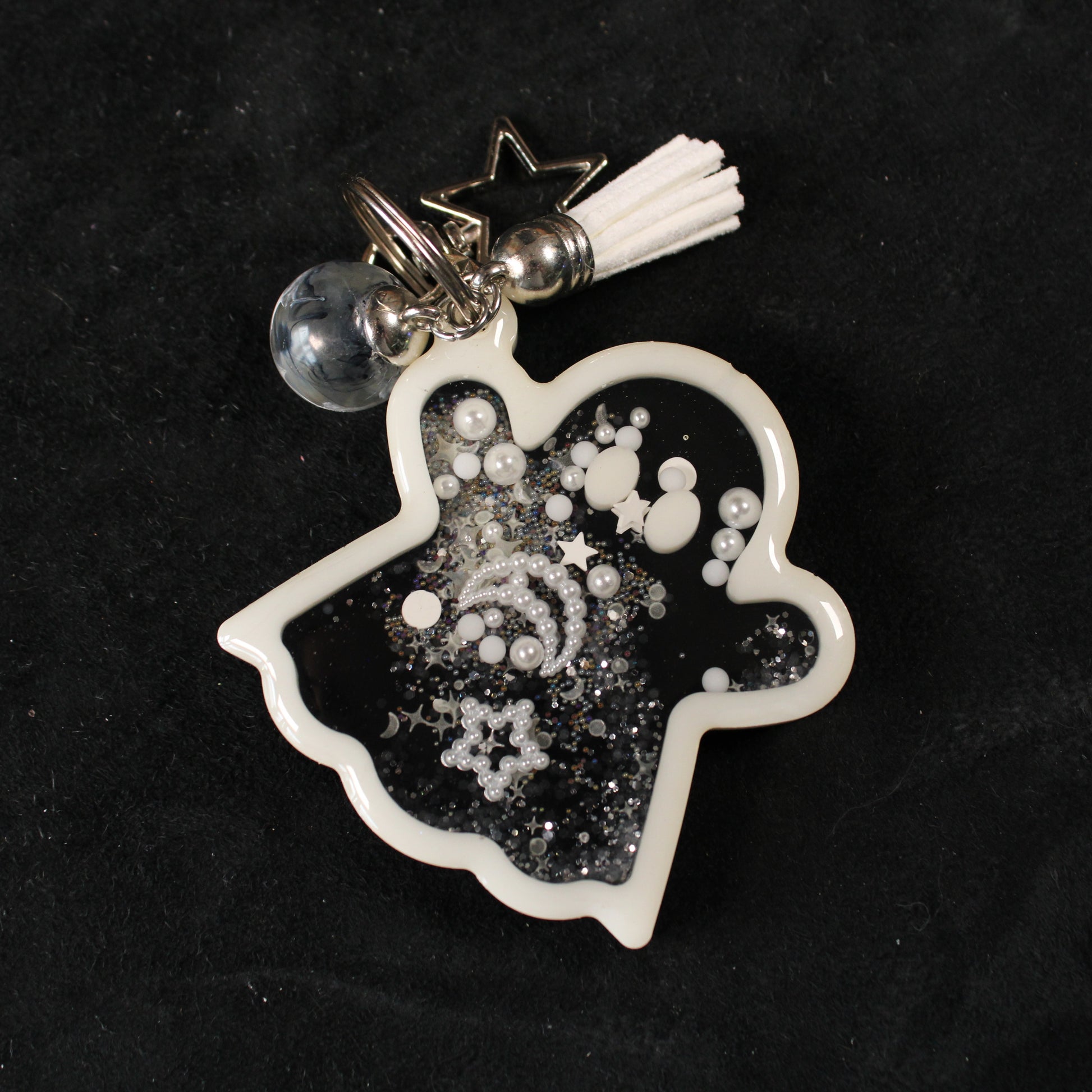A handmade, resin, shaker-charm keychain in the shape of a ghost. Inside the ghost are free-moving beads, glitter, charms, and polymer clay sprinkles suspended in oil. The keychain comes with a variety of extra charms to add to the black and white celestial theme.
