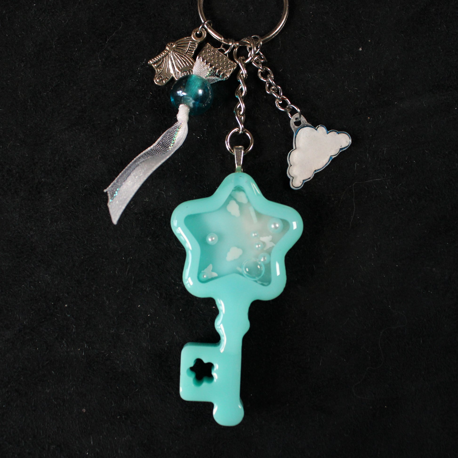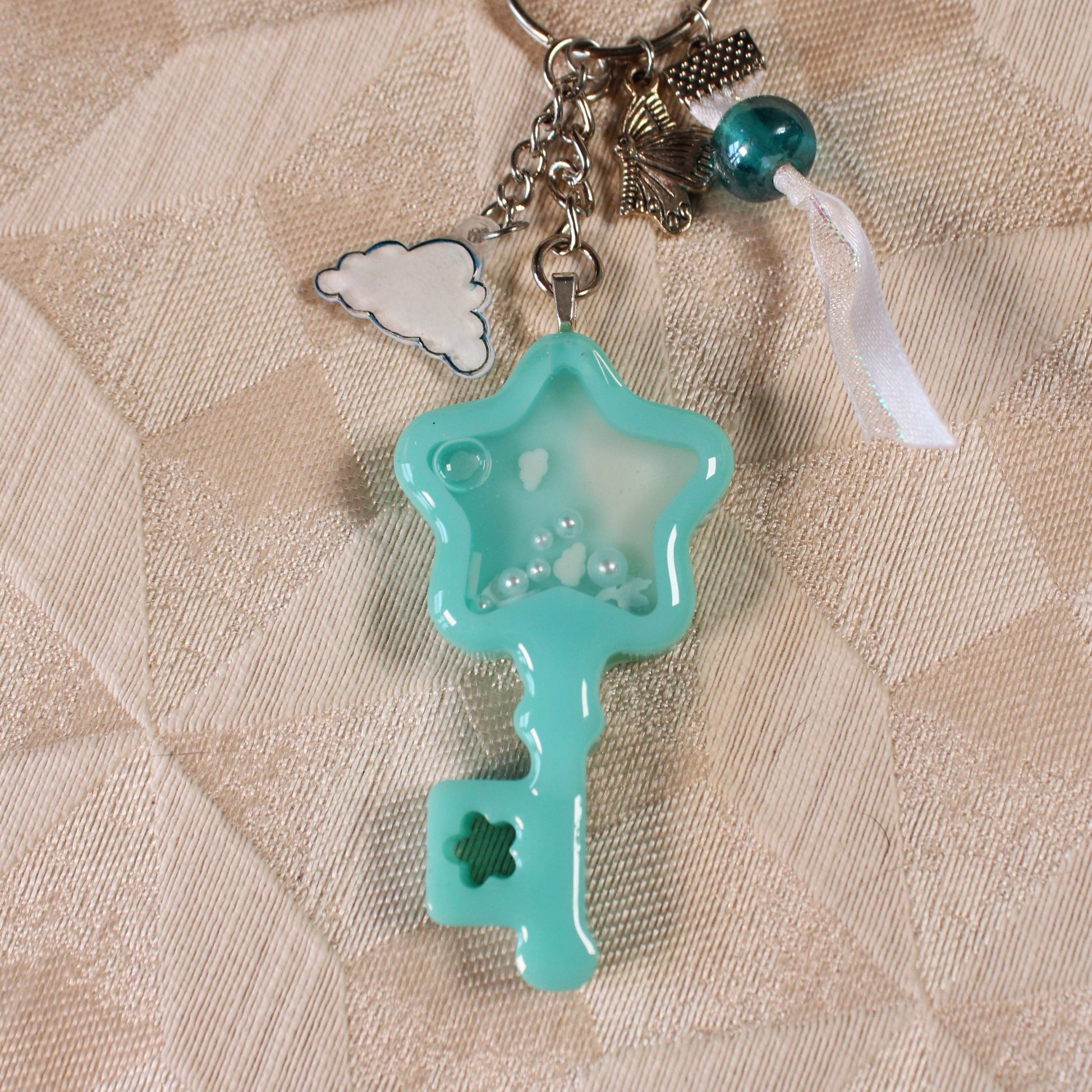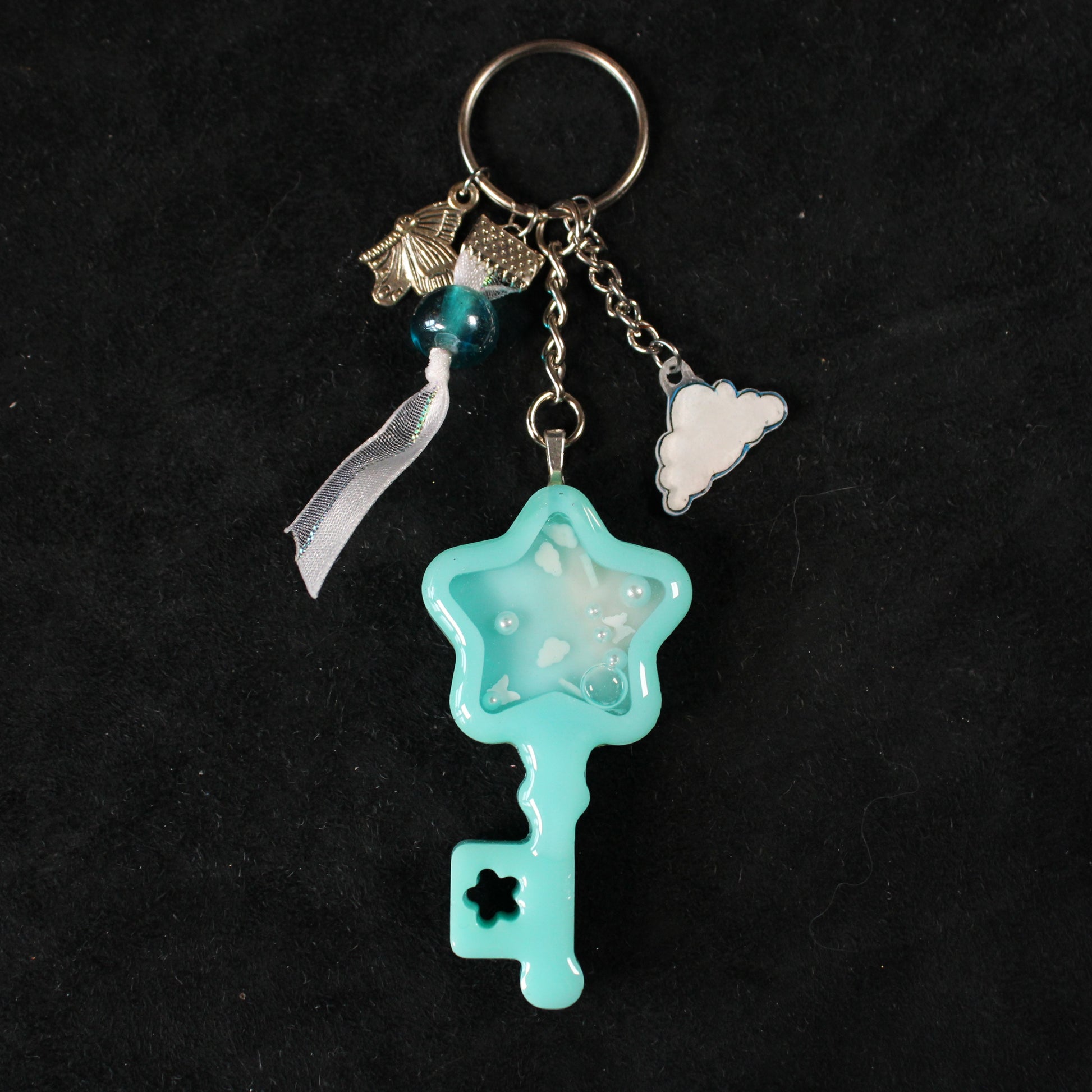 A handmade, resin, shaker-charm keychain in the shape of a key. Inside the key are free-moving beads, glitter, and polymer clay sprinkles suspended in oil. The keychain comes with a variety of extra charms to add to the overall sky theme.