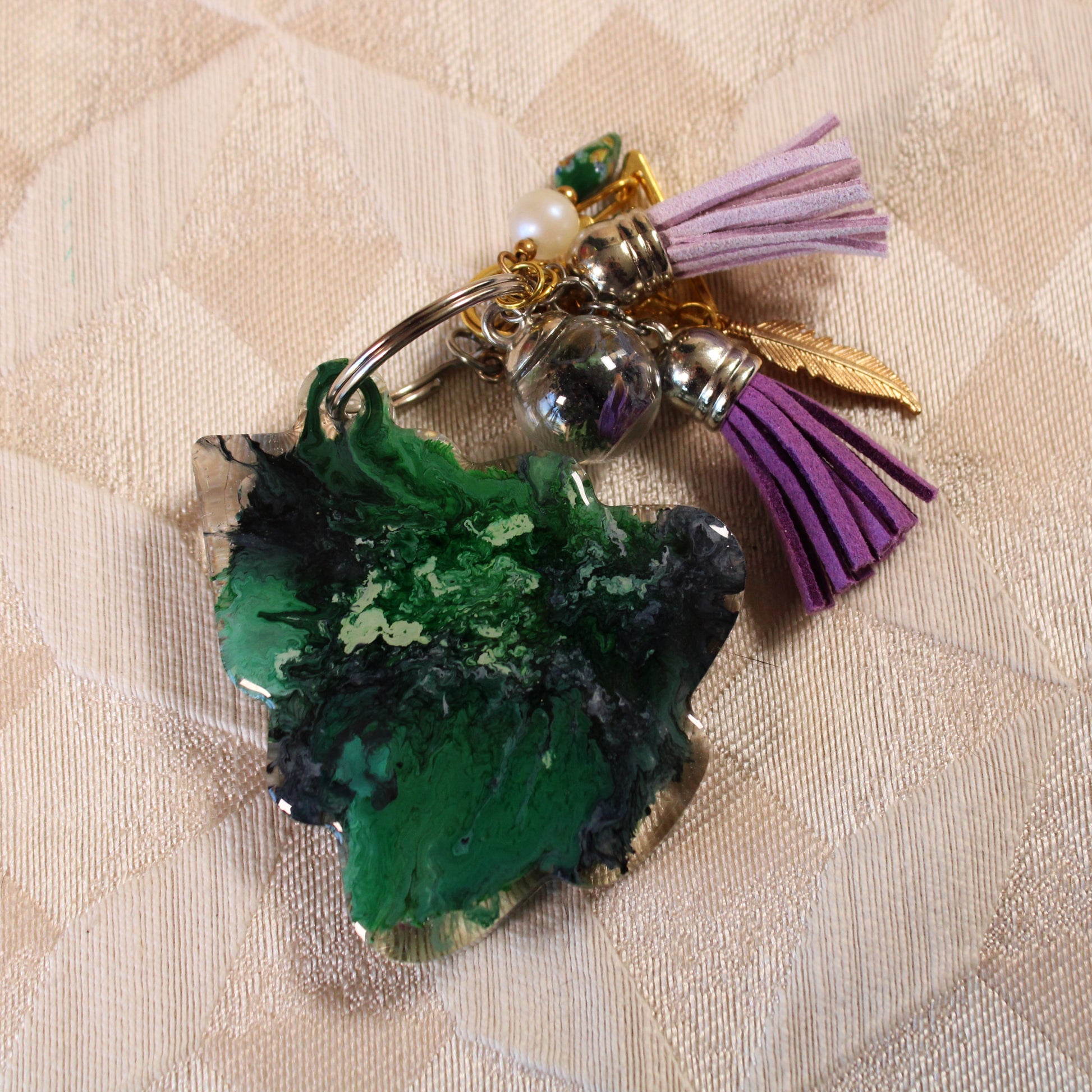 A handmade, resin, shaker-charm keychain in the shape of a tree. Inside the tree are free-moving beads, charms, and polymer clay sprinkles suspended in oil. The keychain comes with a variety of extra charms to add to the overall dark, foresty vibe.