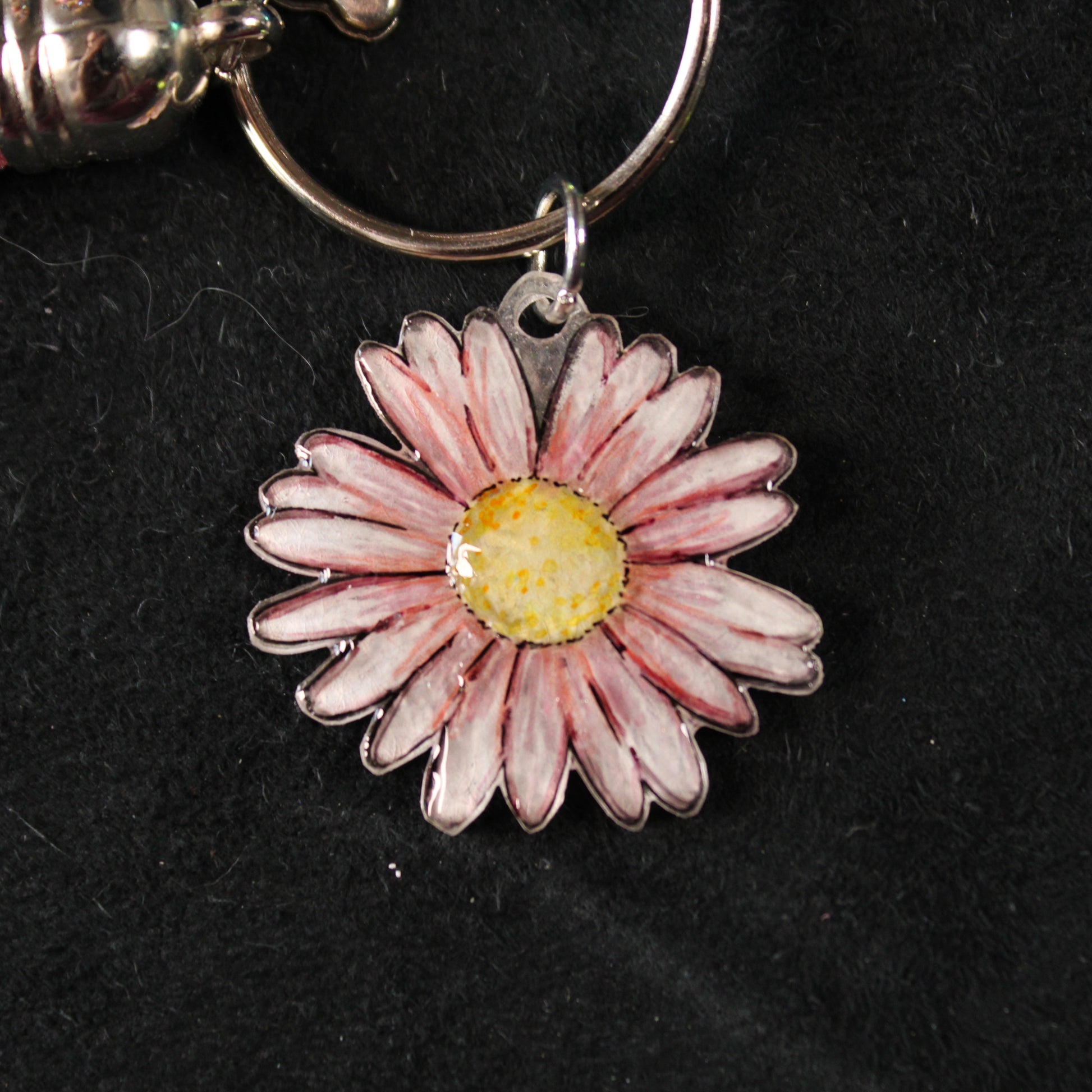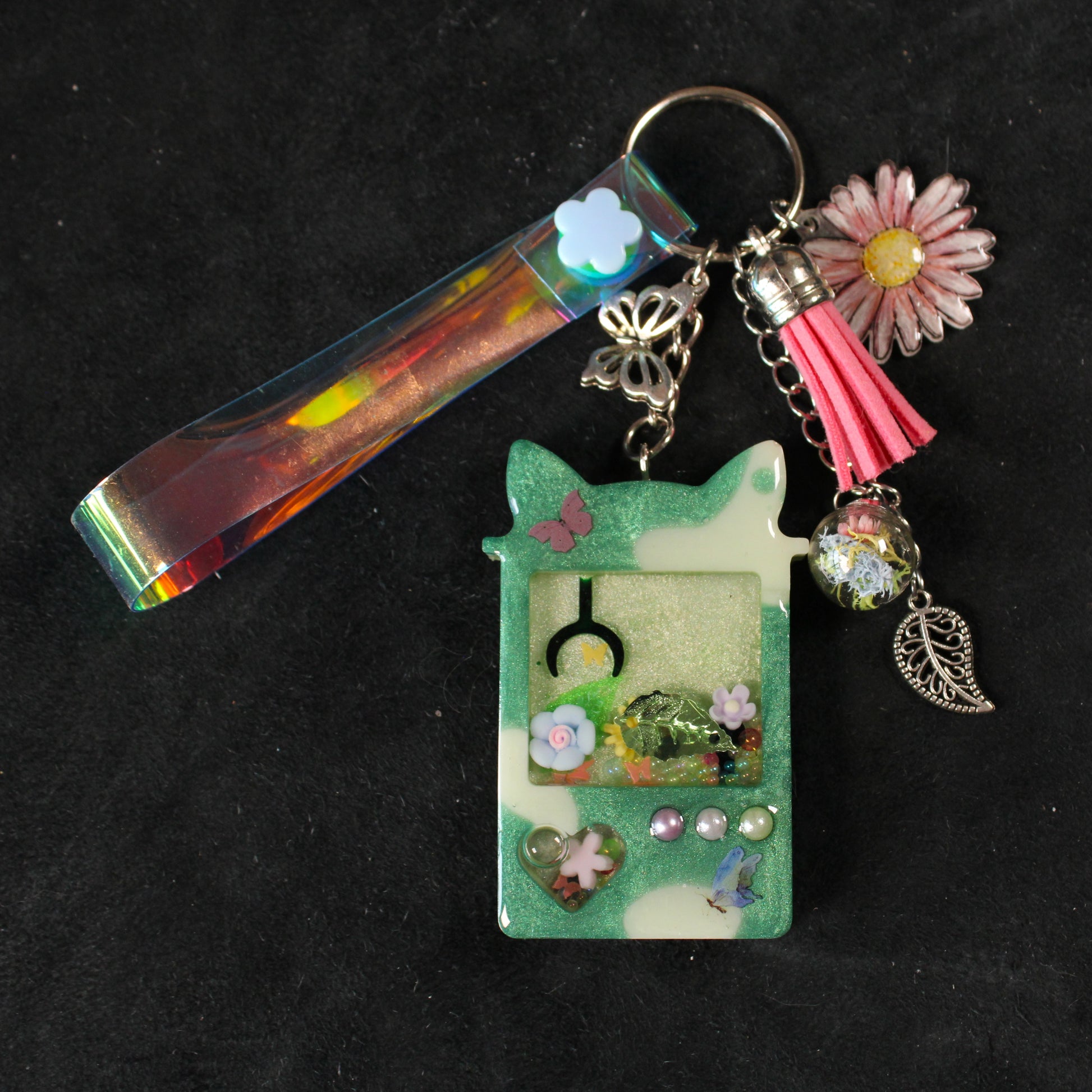 A handmade, resin, shaker-charm keychain in the shape of a little claw machine. Inside the shaker are free-moving beads, glitter, and flower-shaped charms suspended in oil. The keychain comes with a variety of extra charms, including a hand-drawn flower, to add to the overall fairy forest vibe.
