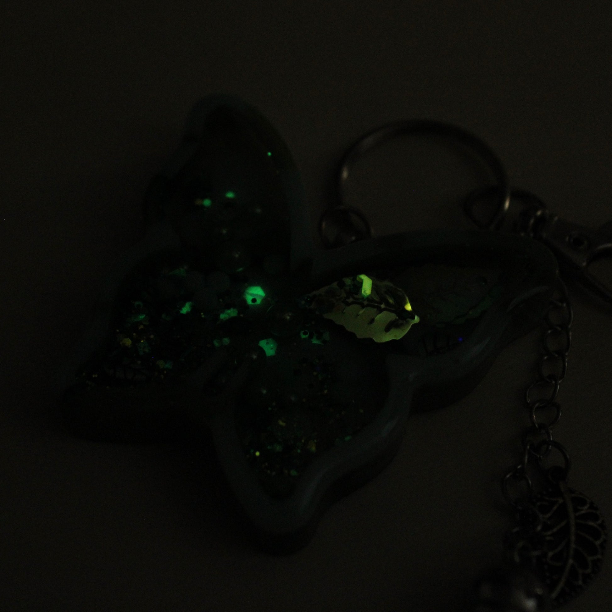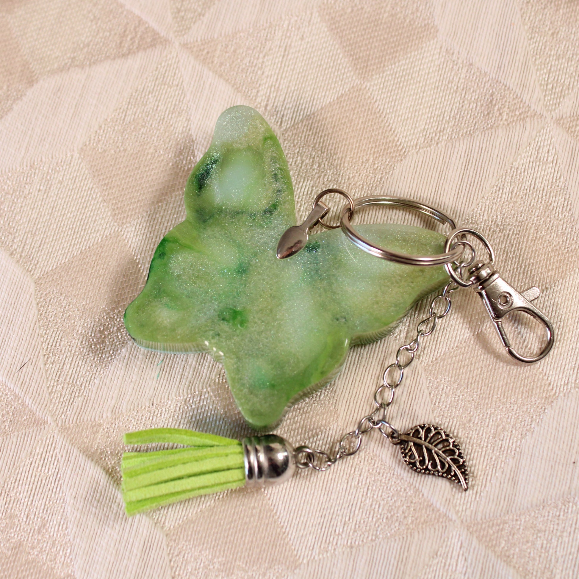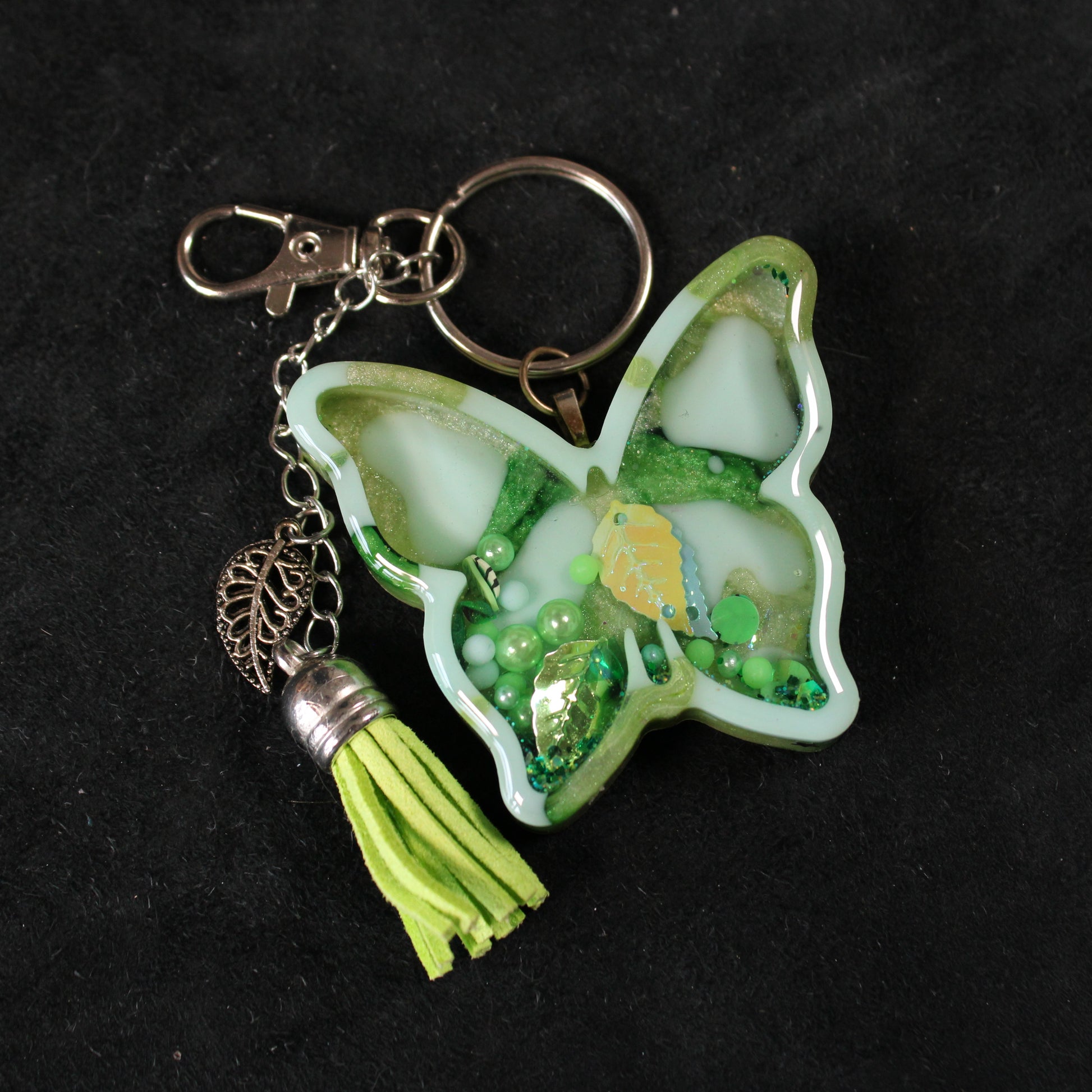 A handmade, resin, shaker-charm keychain in the shape of a green butterfly. Inside the butterfly are free-moving beads, glitter, leaf sequins, and polymer clay sprinkles suspended in oil. The keychain comes with a couple of extra charms to add to the overall leafy vibe
