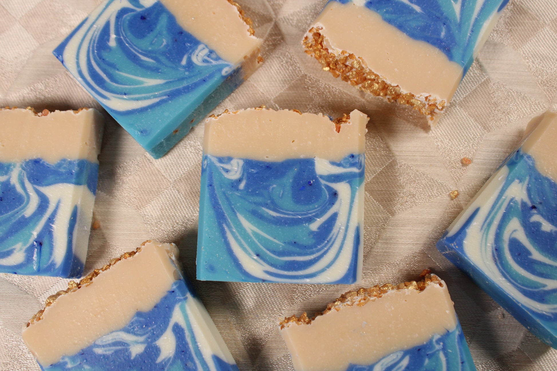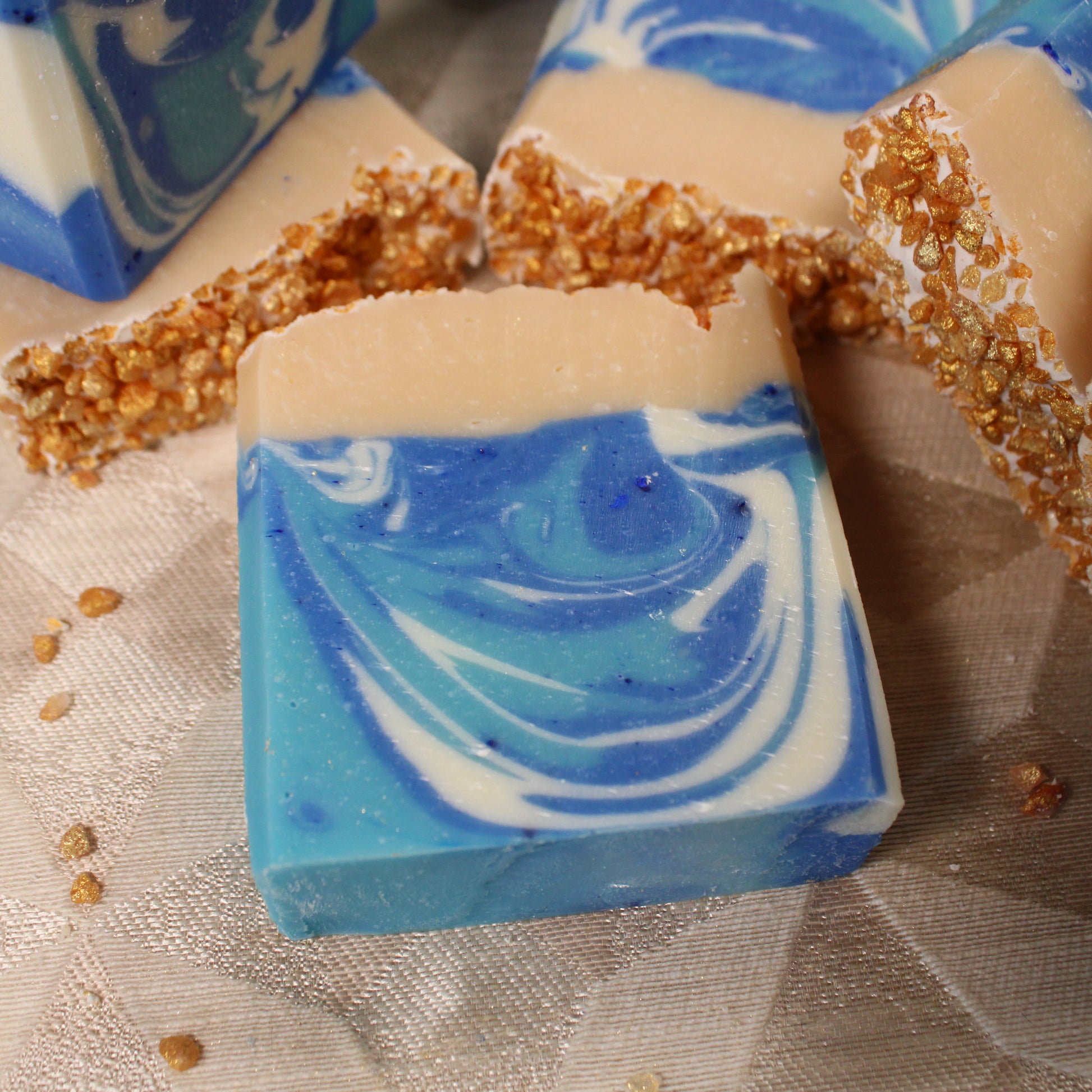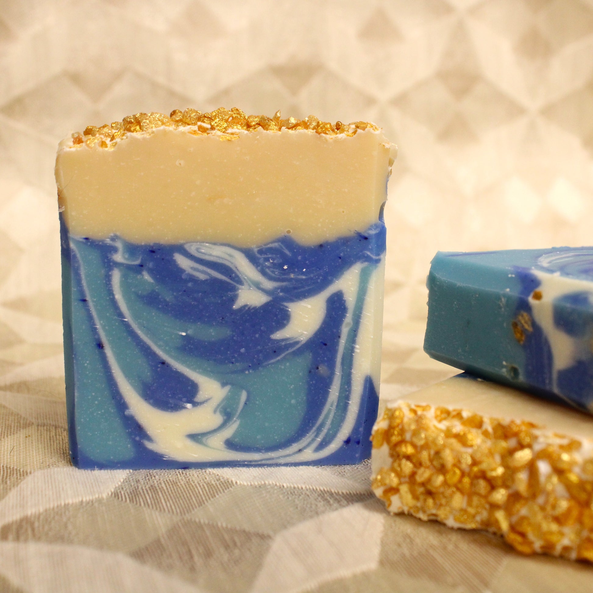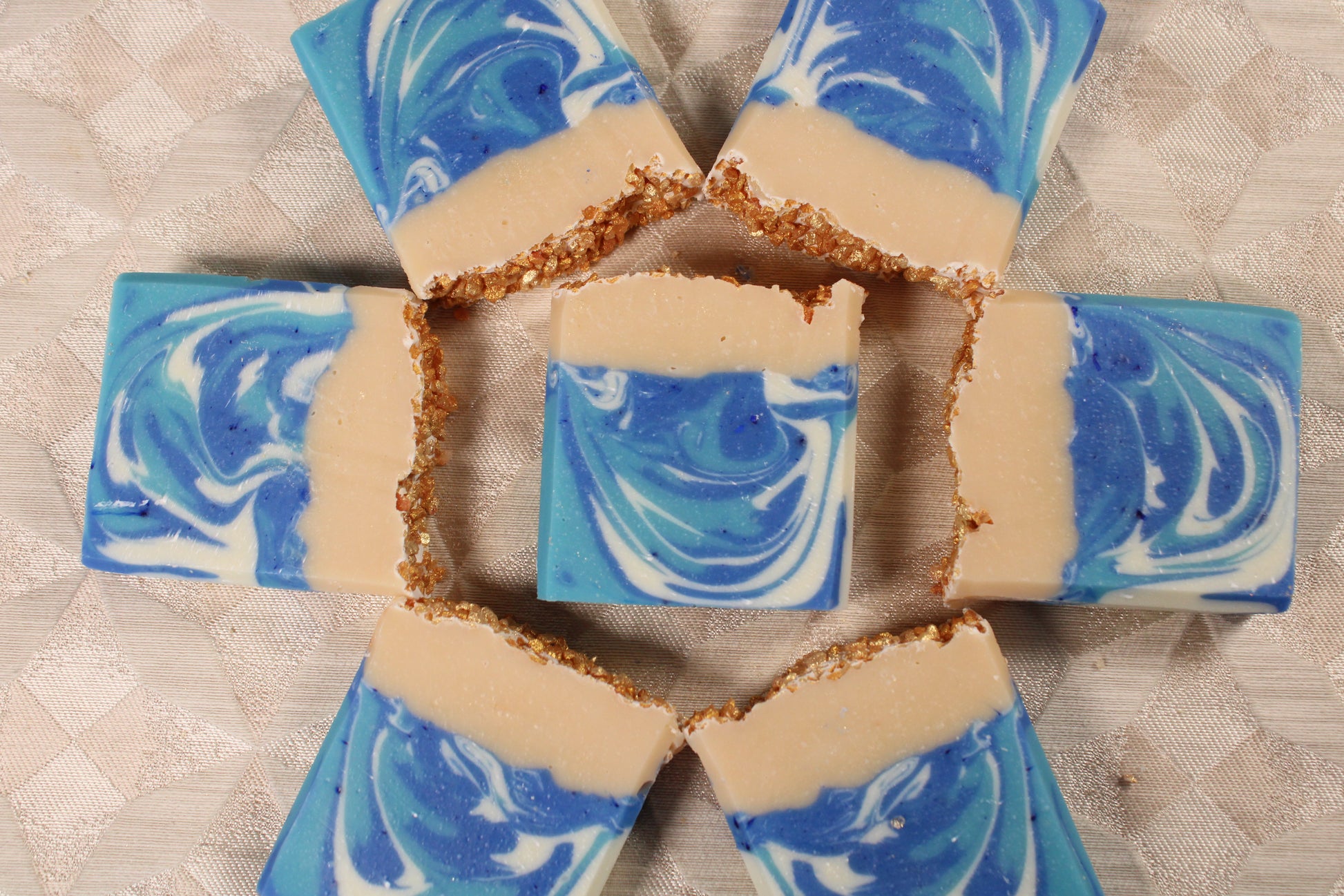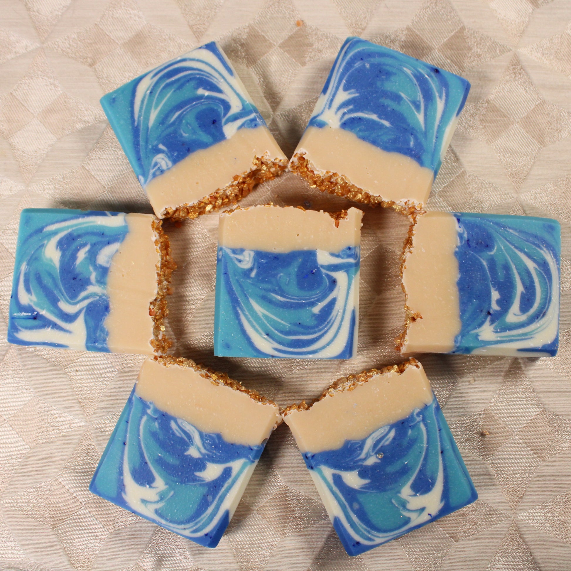 This soap is cold process soap which is created through the mixing of various oils and lye. It has been colored with mica powders and scented with the fragrance oil "sea salt" from Bramble Berry. Each bar is roughly 4oz.
