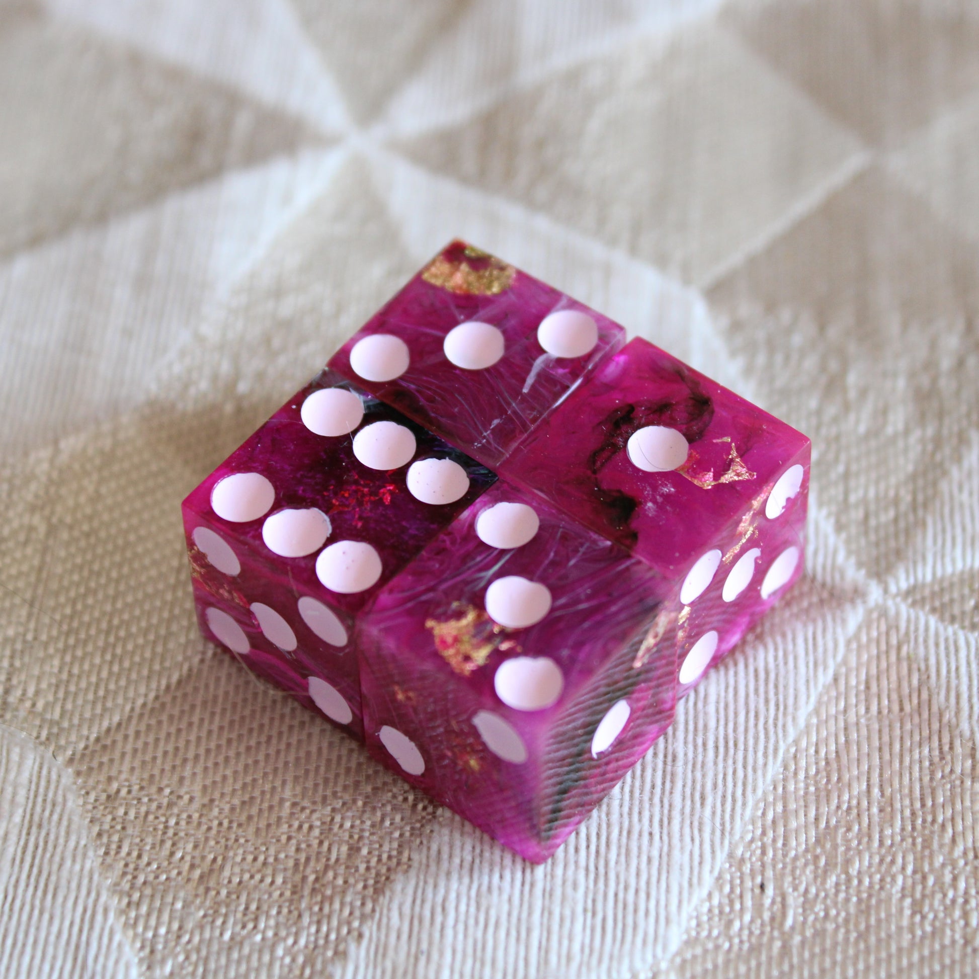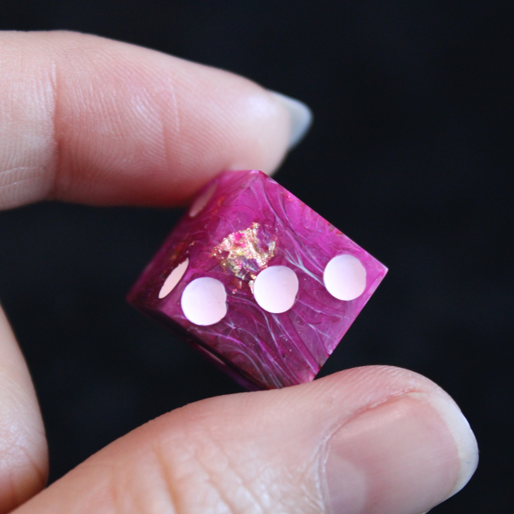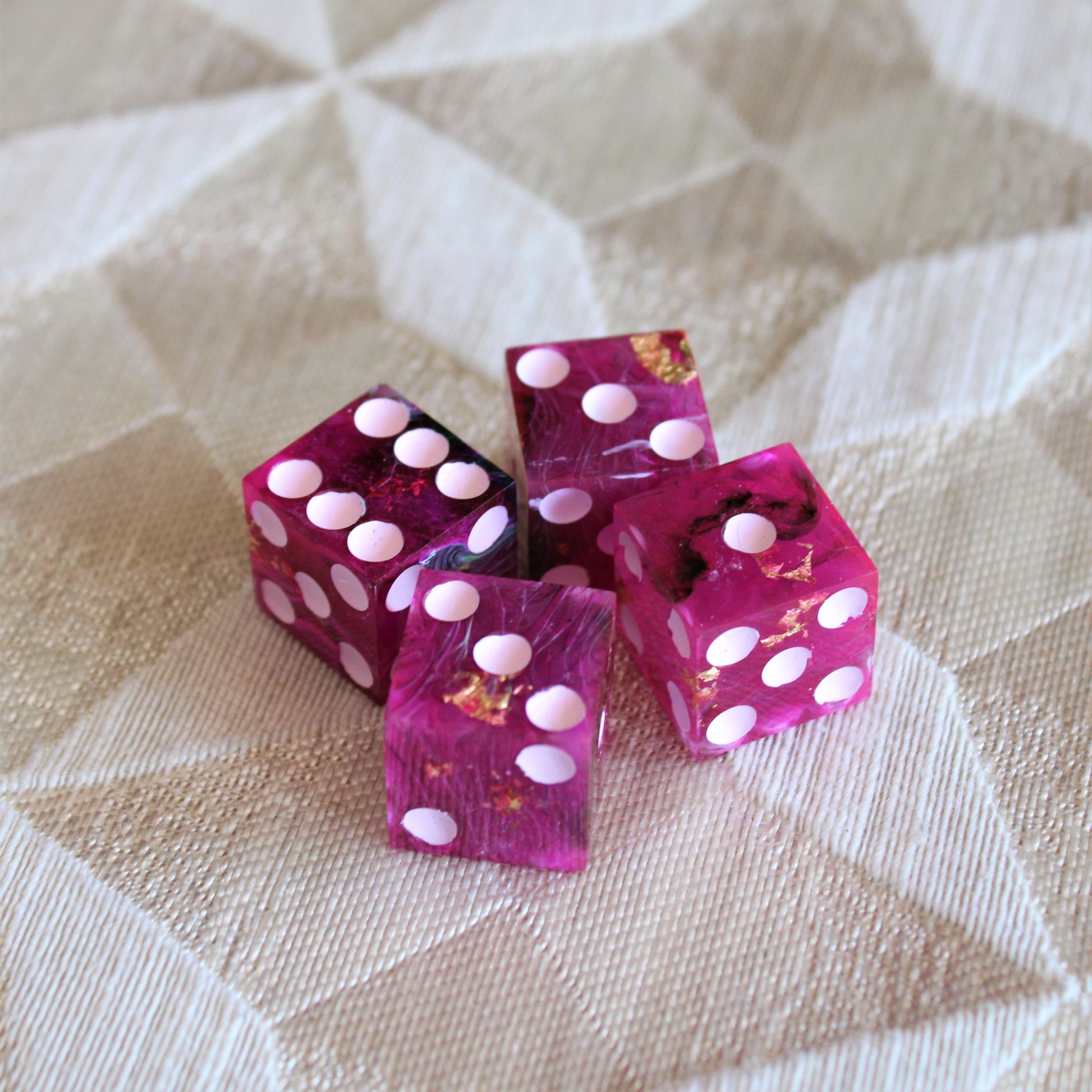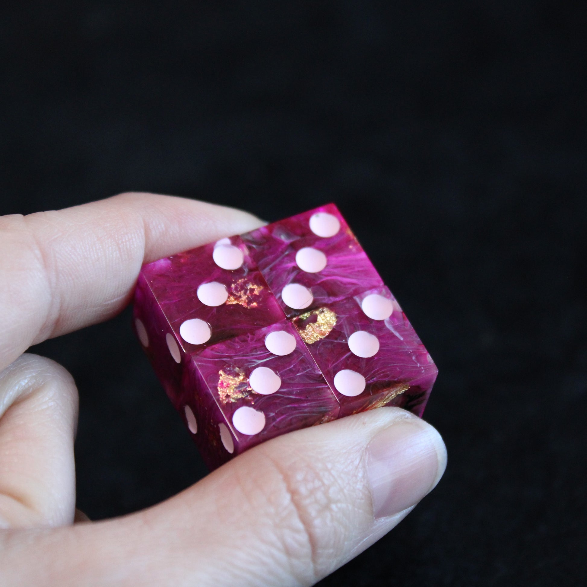 These pink dice contain swirls of something darker, and the occasional flash of something golden. The pips are a pale pink.