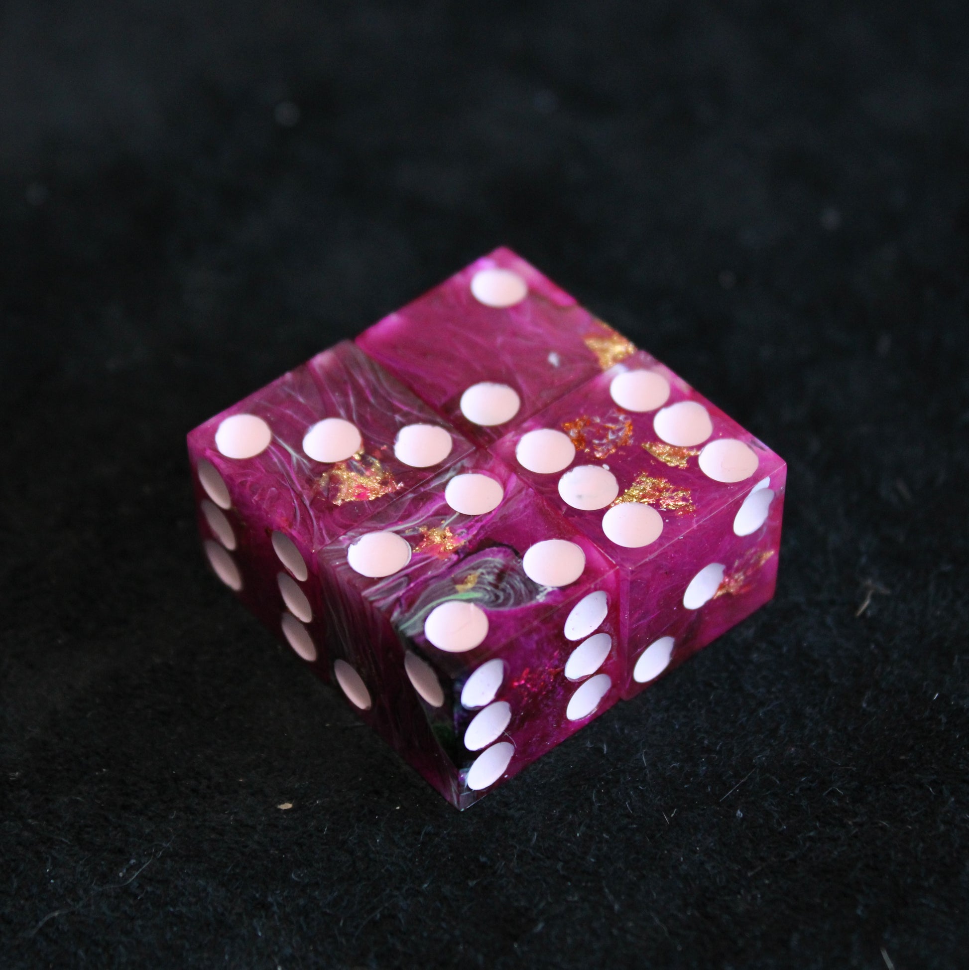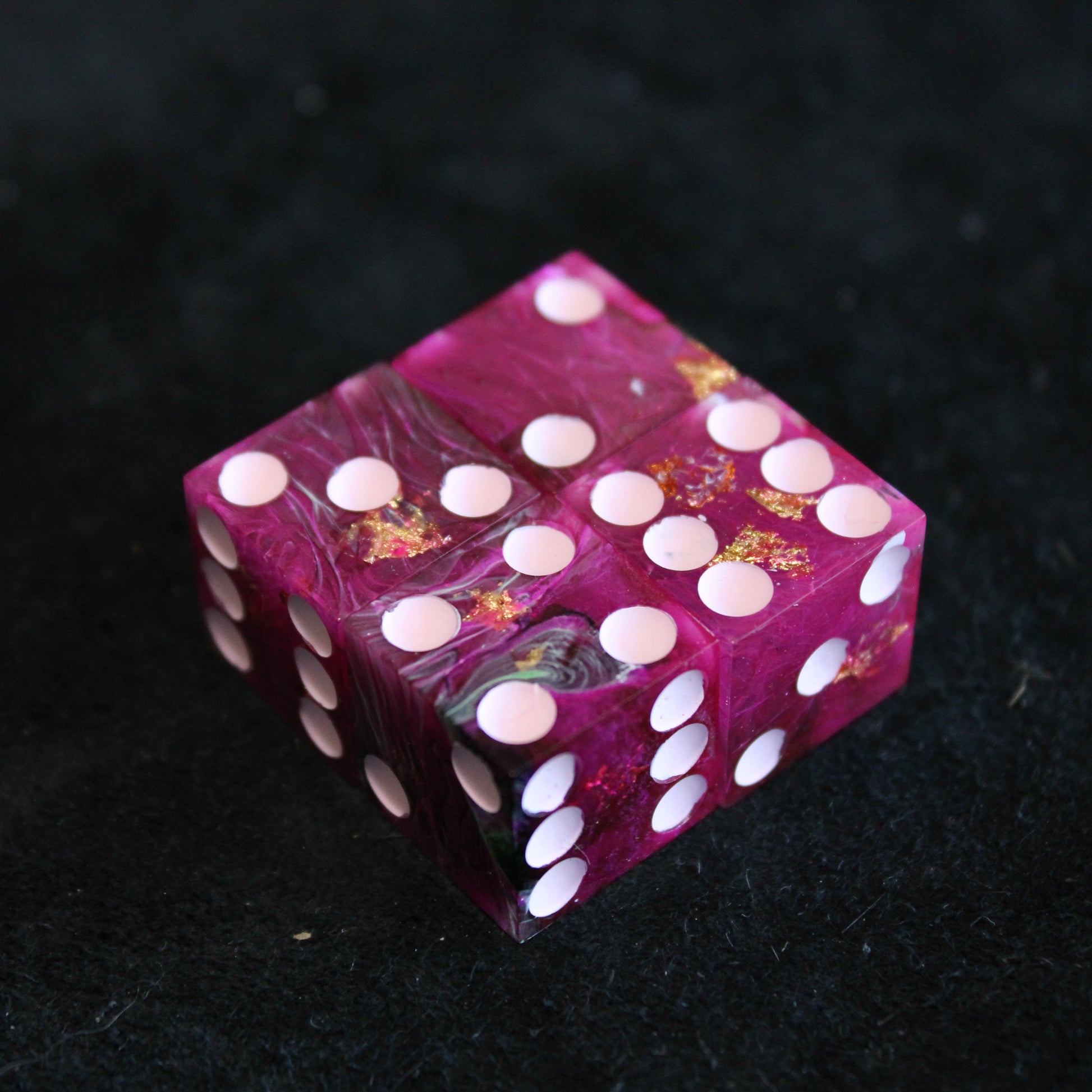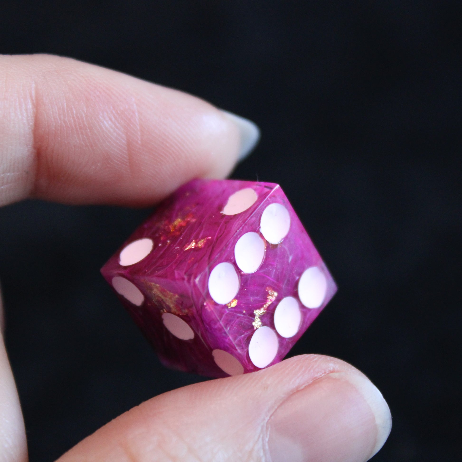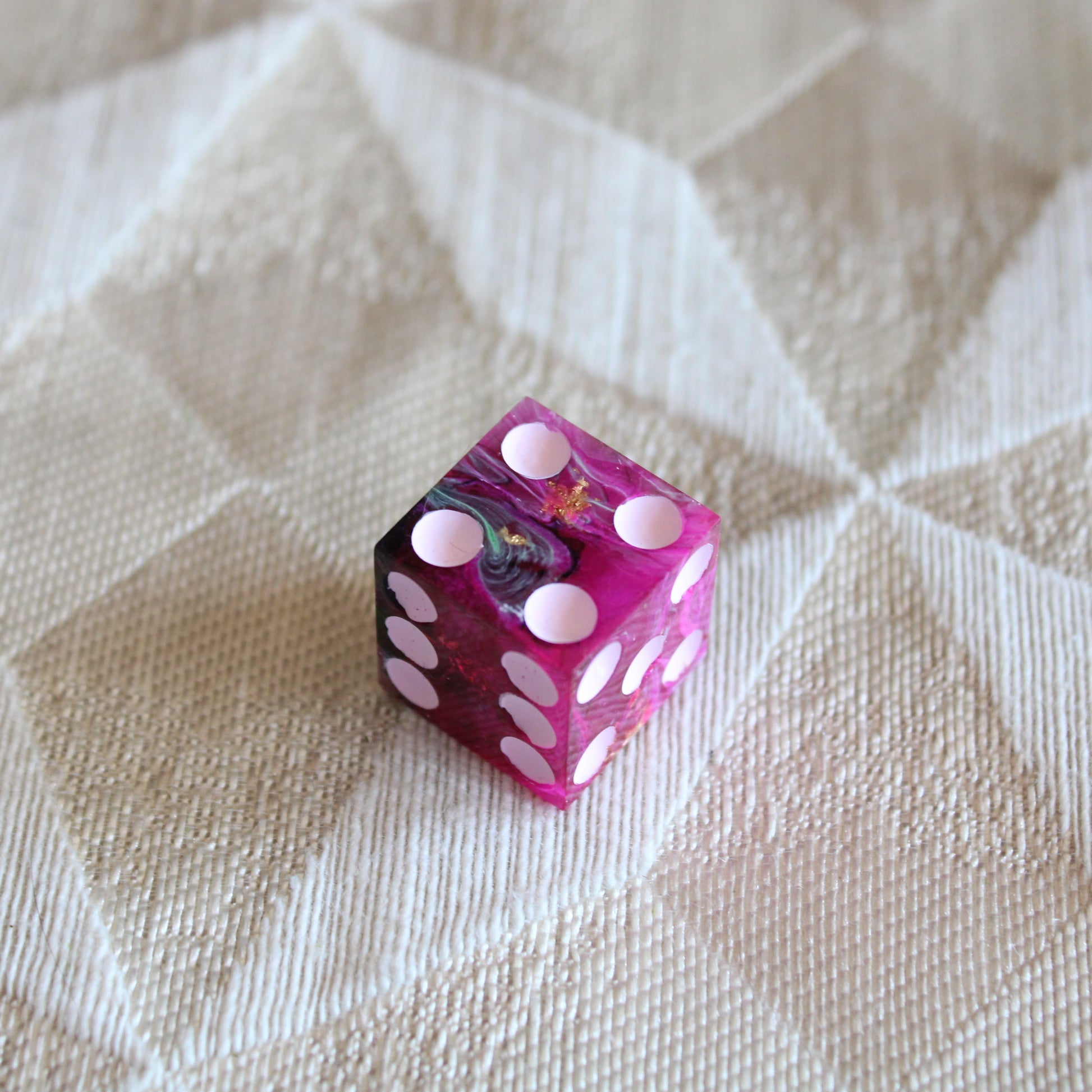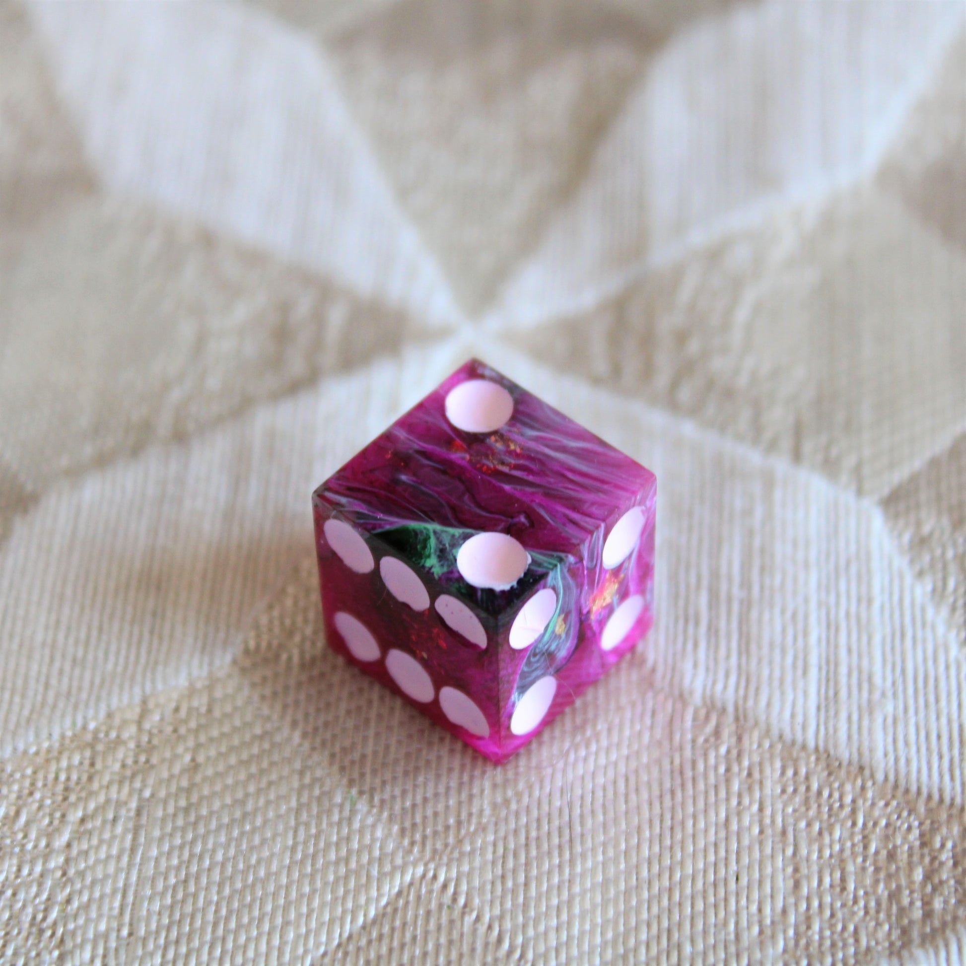 These pink dice contain swirls of something darker, and the occasional flash of something golden. The pips are a pale pink.