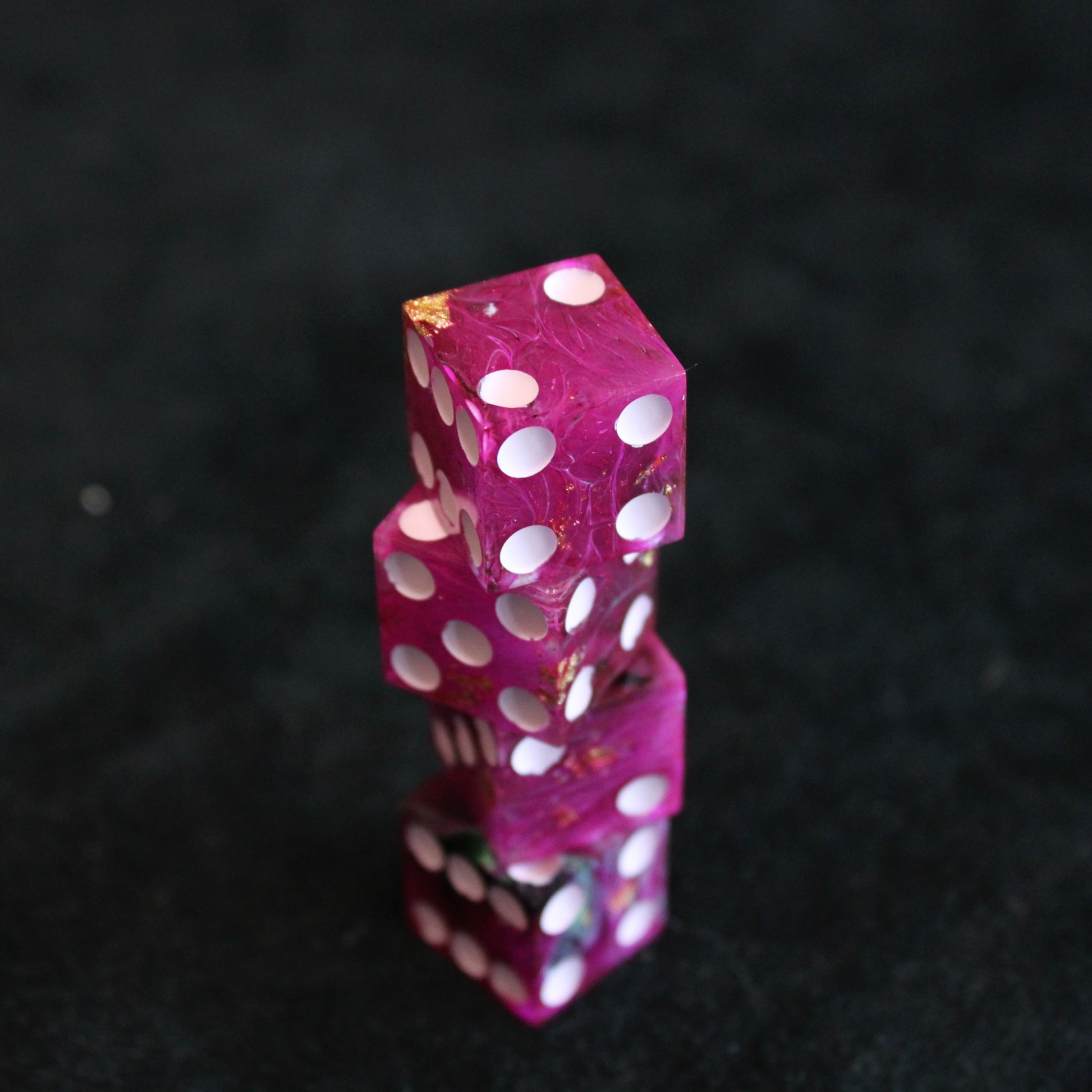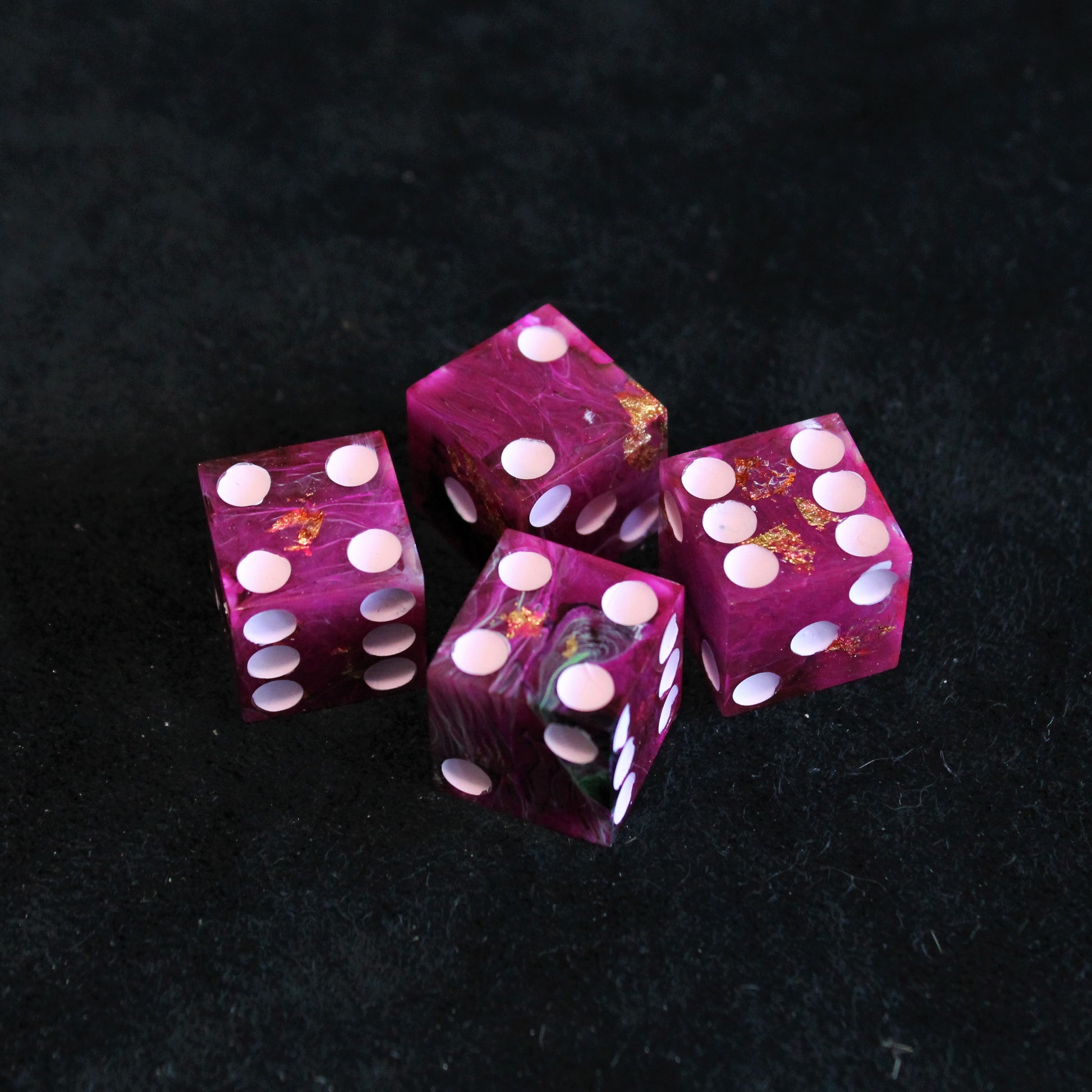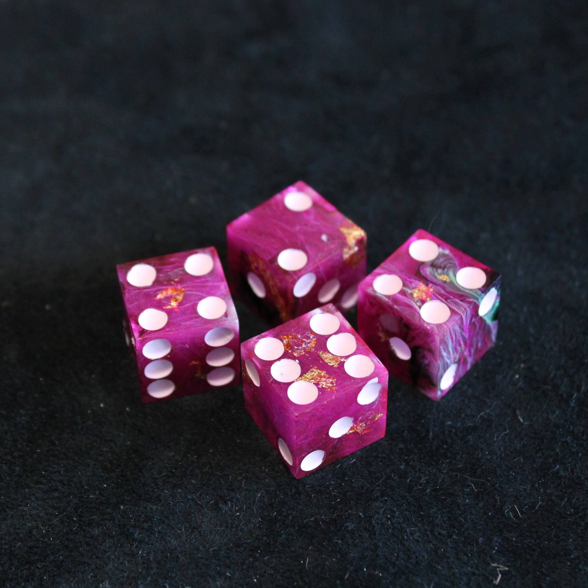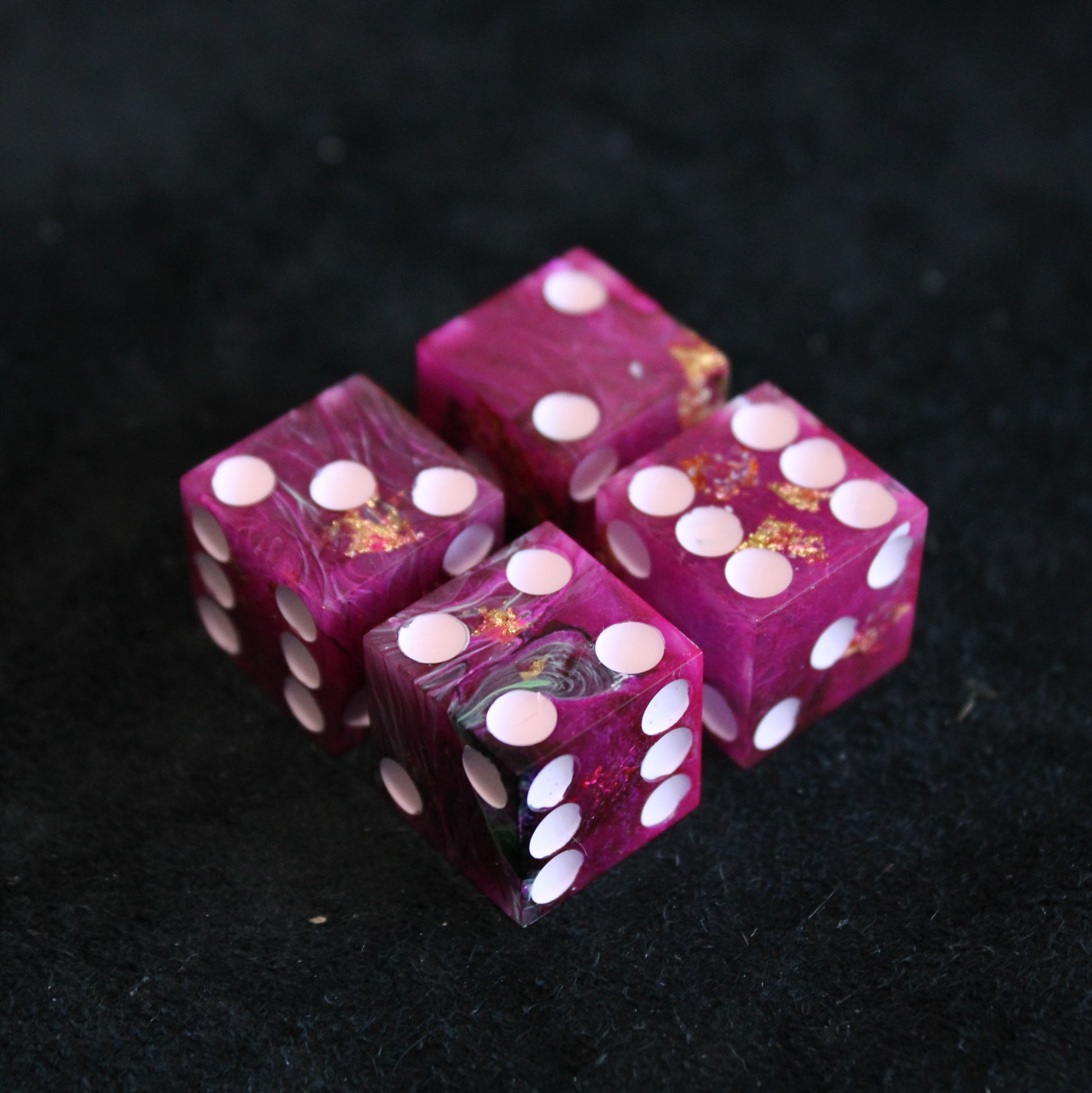 These pink dice contain swirls of something darker, and the occasional flash of something golden. The pips are a pale pink.
