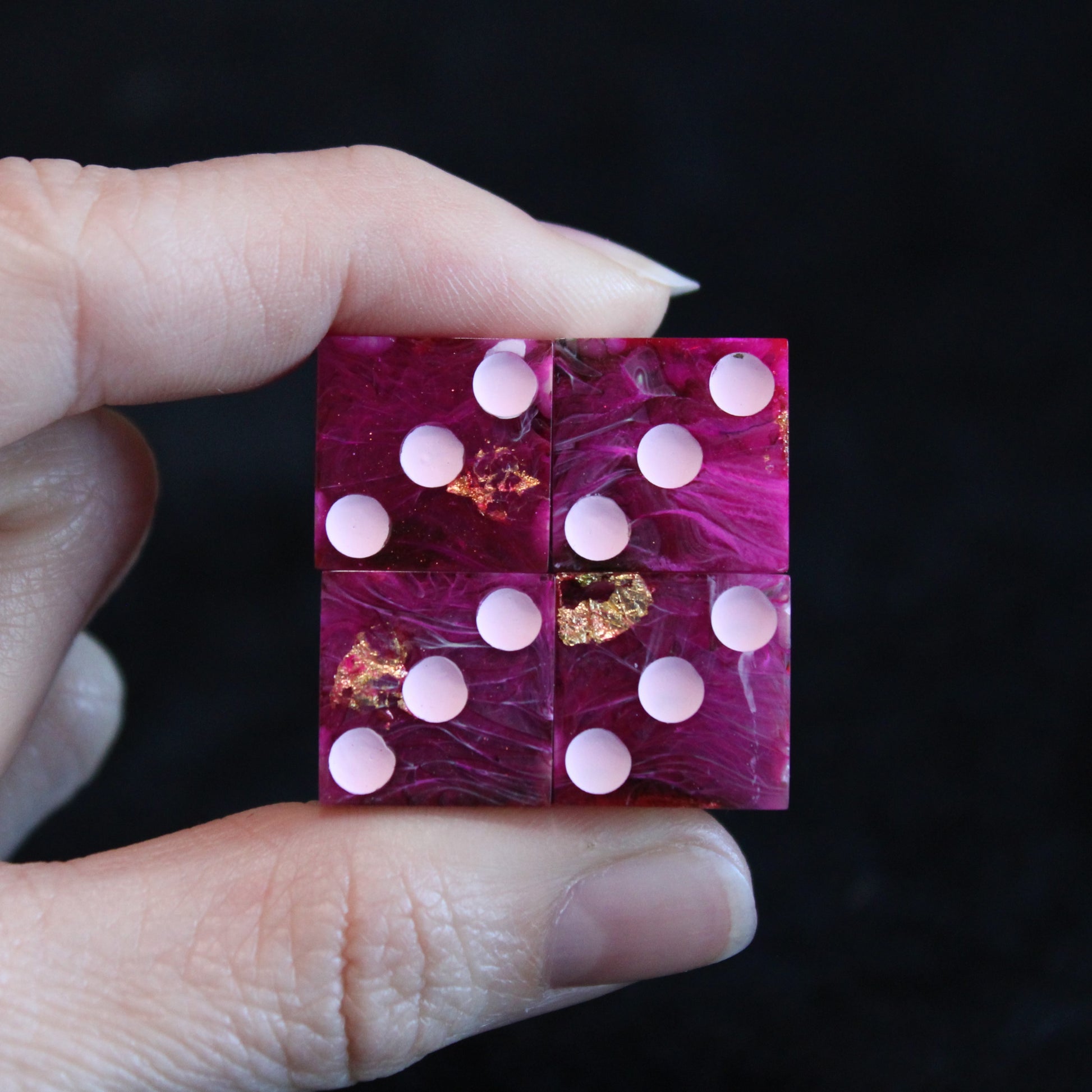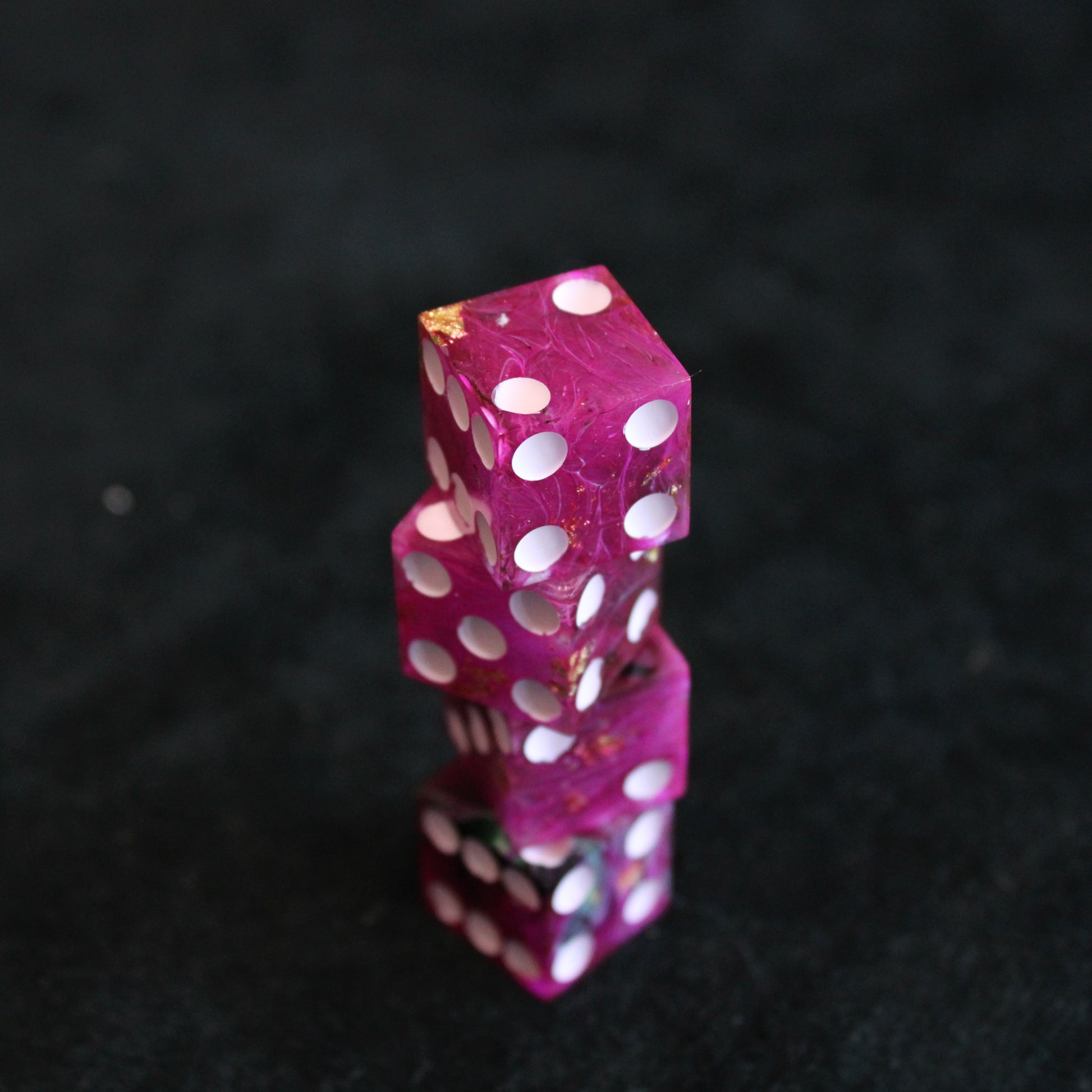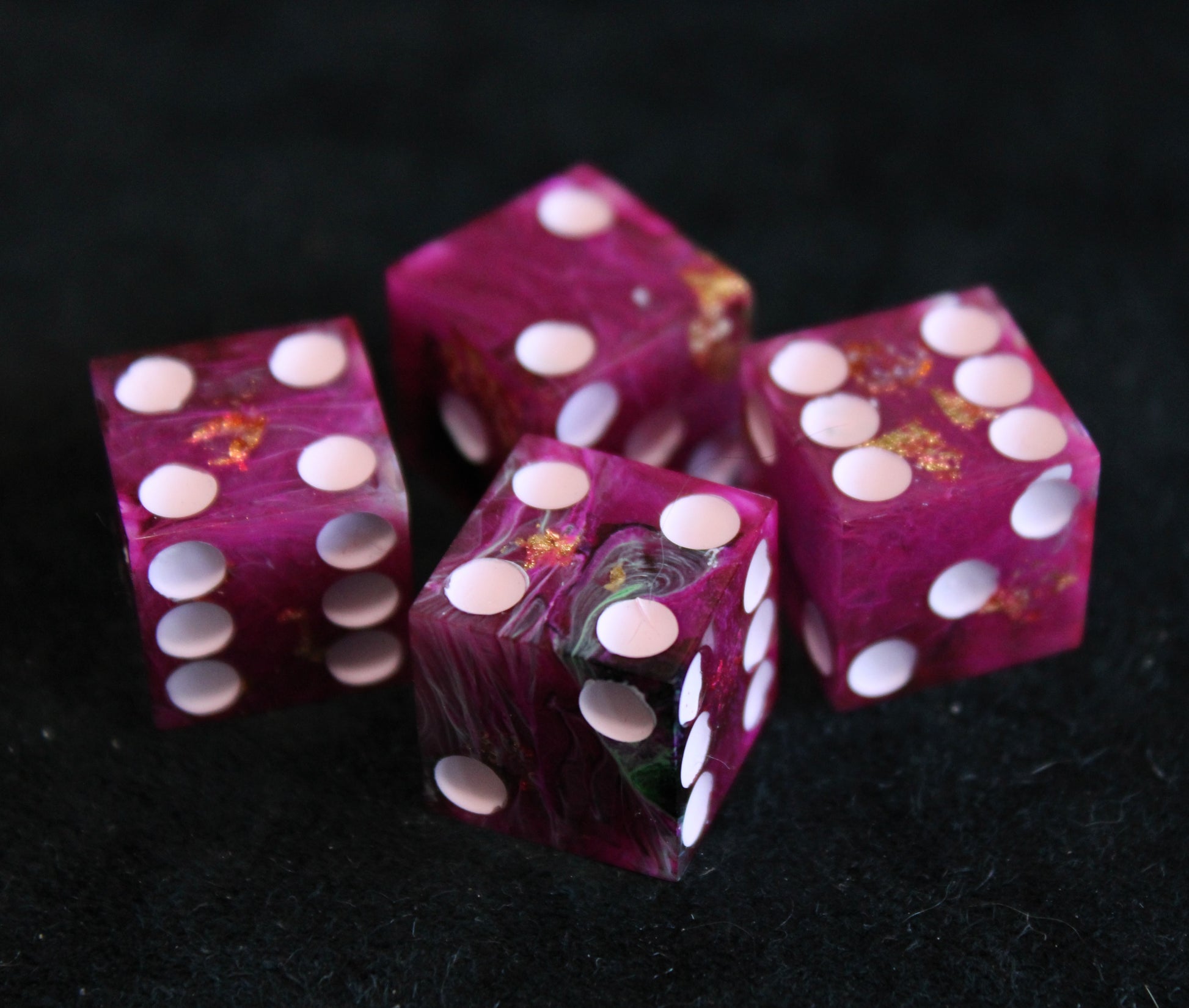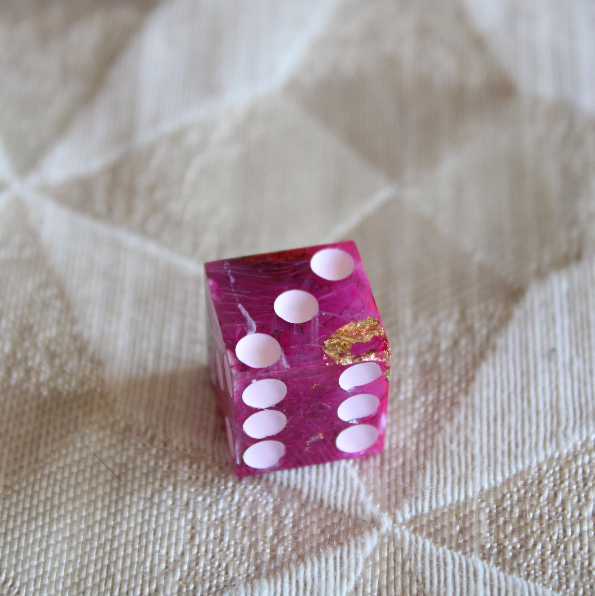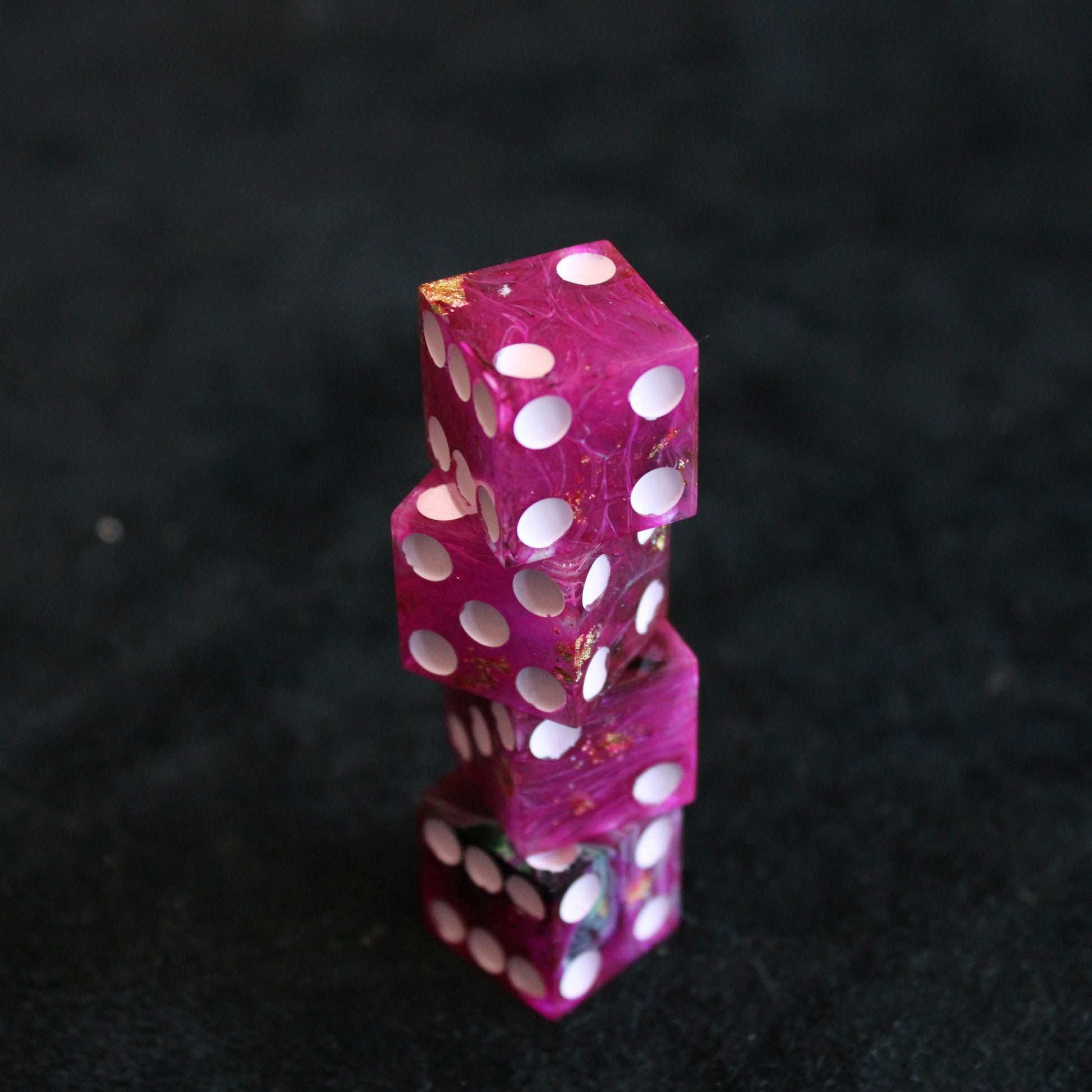 These pink dice contain swirls of something darker, and the occasional flash of something golden. The pips are a pale pink.