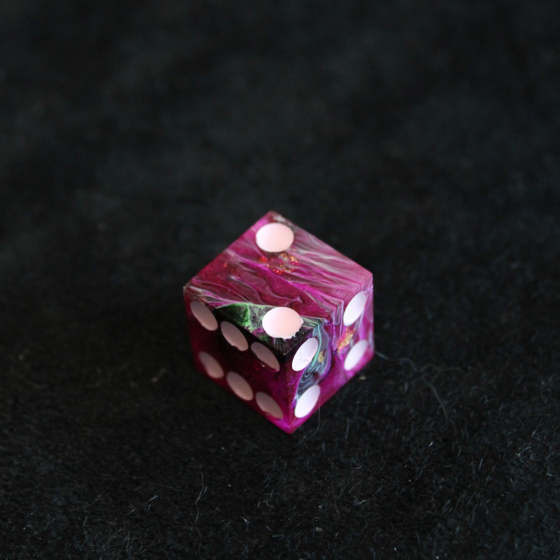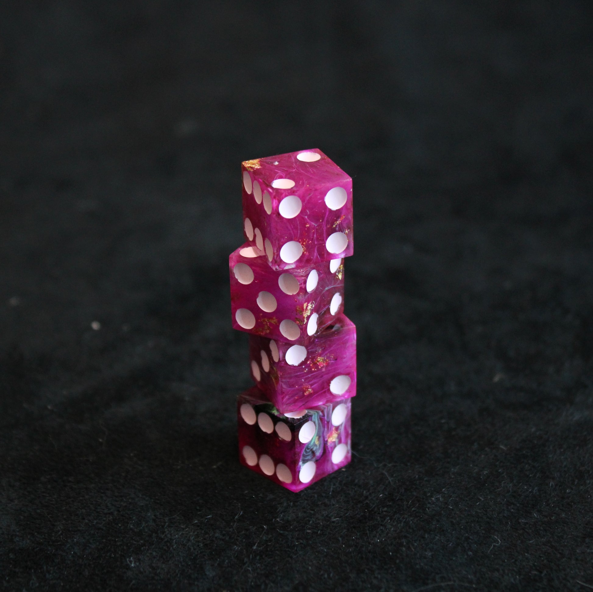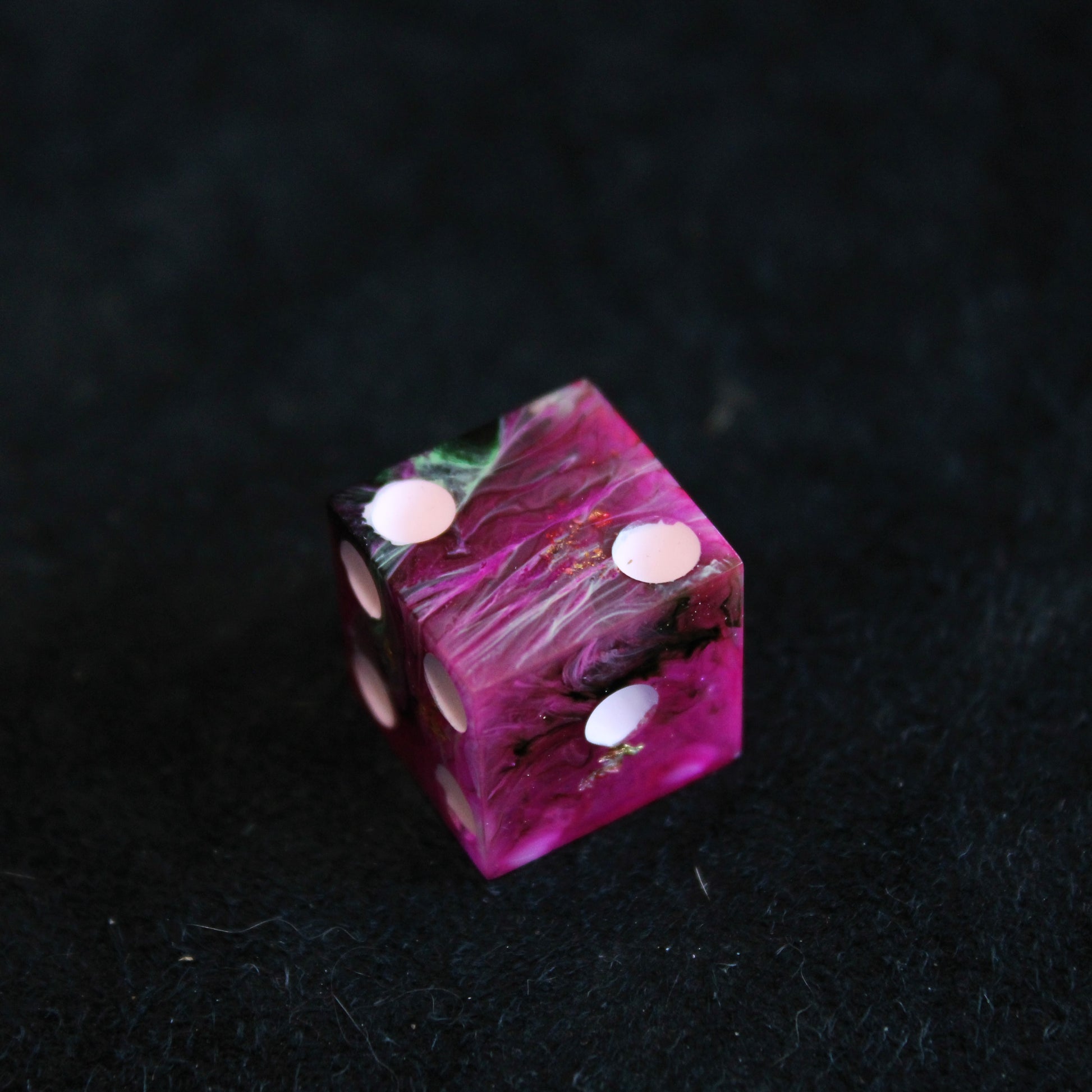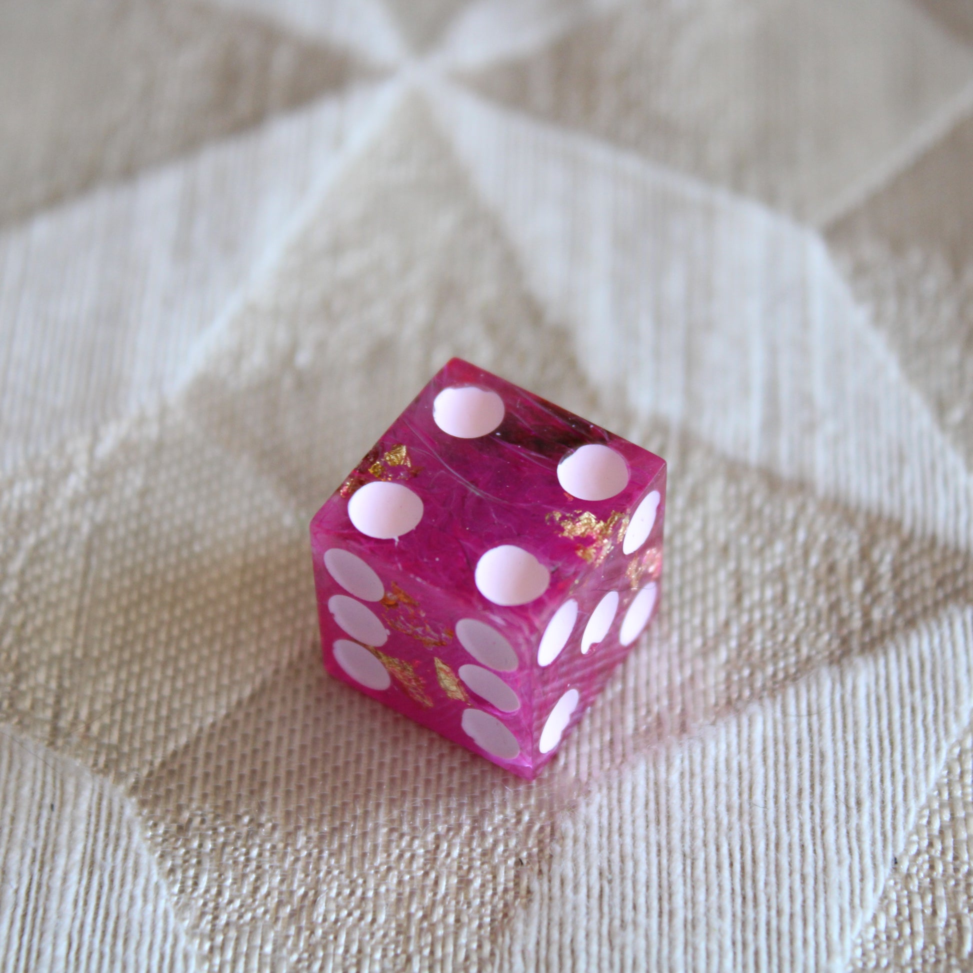 These pink dice contain swirls of something darker, and the occasional flash of something golden. The pips are a pale pink.