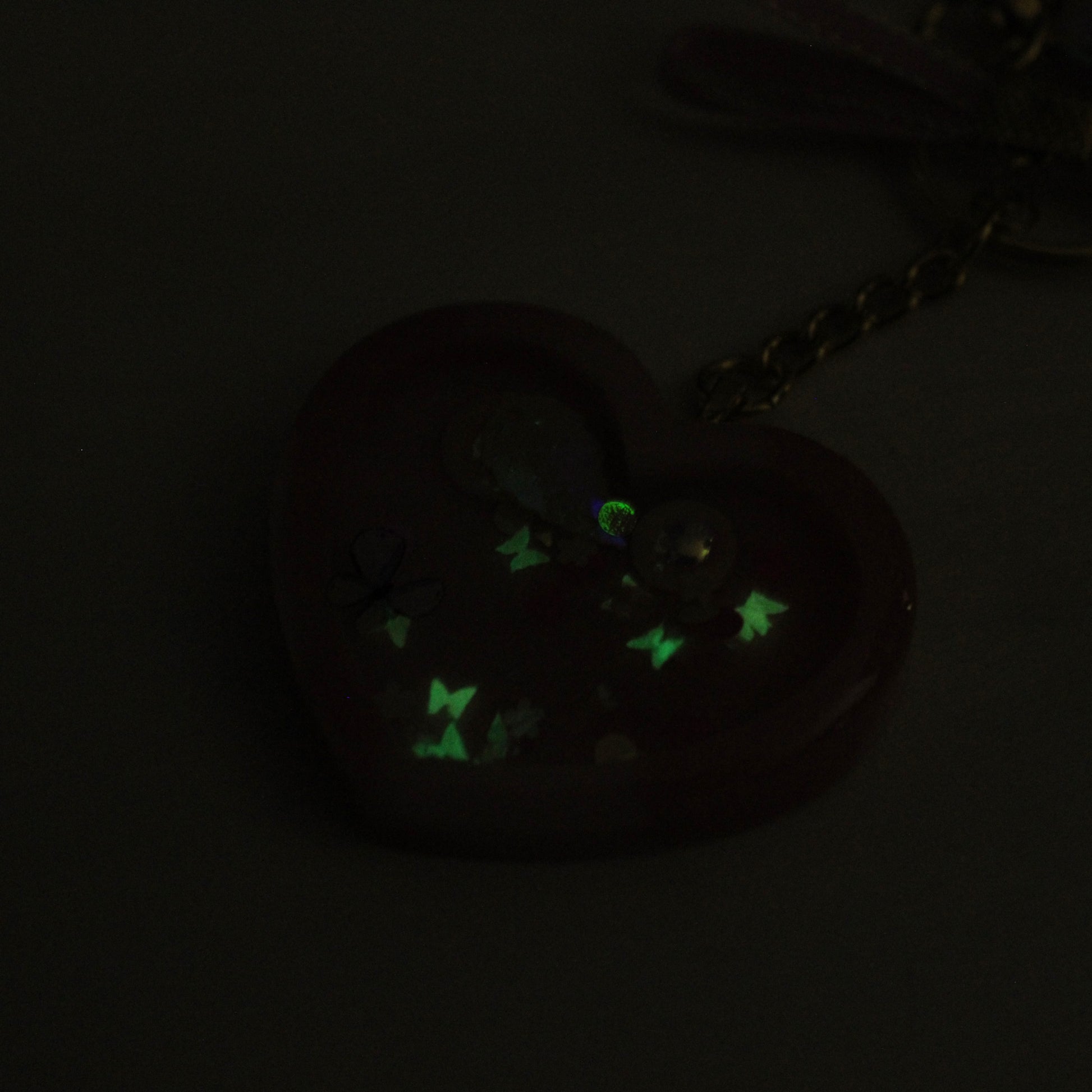 A handmade, resin, shaker-charm keychain in the shape of a pink heart. Inside the heart are free-moving beads, glitter, and sequins suspended in oil. The keychain comes with a couple of extra charms to add to the overall cutesy look.
