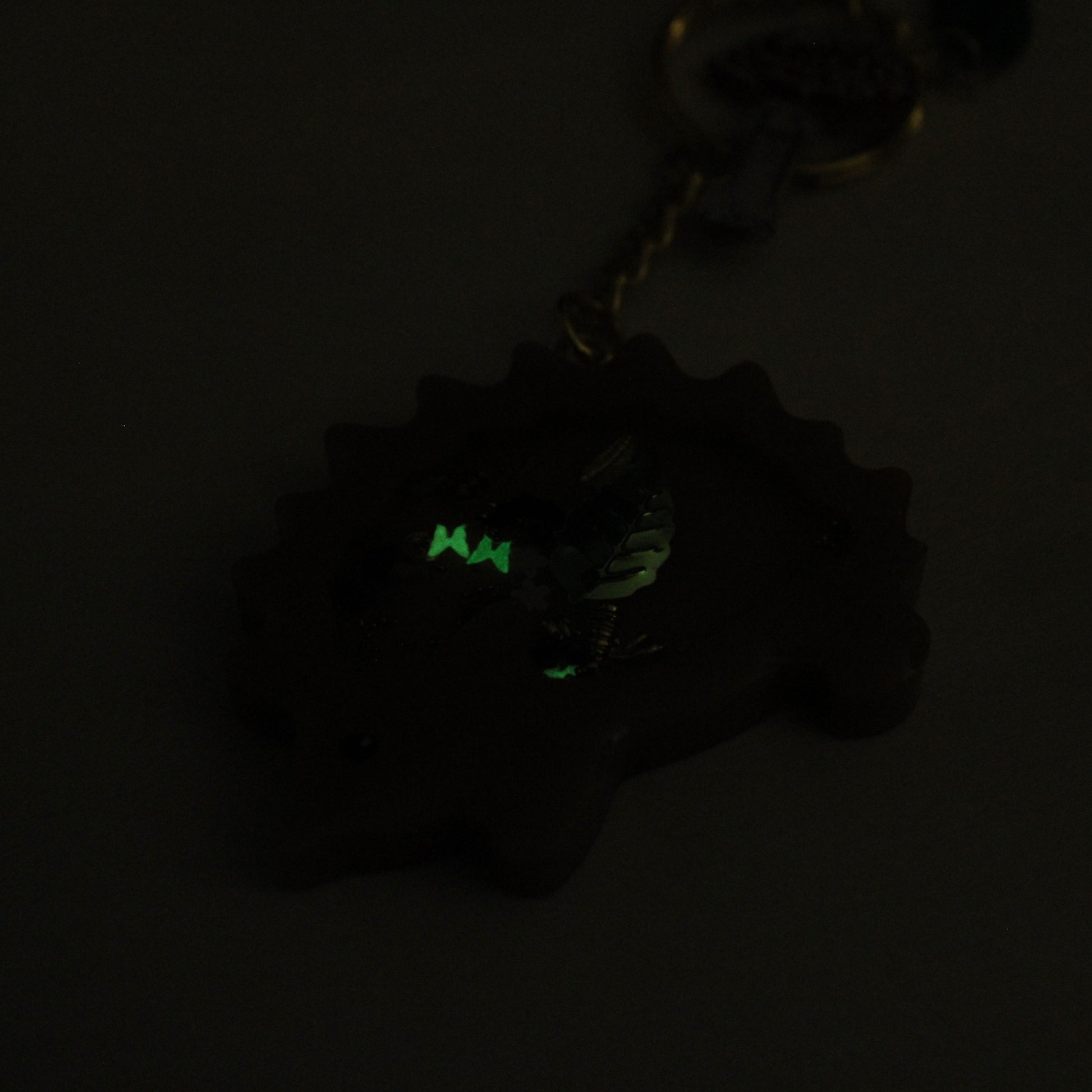 A handmade, resin, shaker-charm keychain in the shape of a little hedgehog. Inside the hedgehog are free-moving beads, charms, sequins, and polymer clay mushrooms suspended in oil. The keychain comes with a variety of extra charms, including a handmade mushroom and leaf, and a little glass orb filled with flowers.