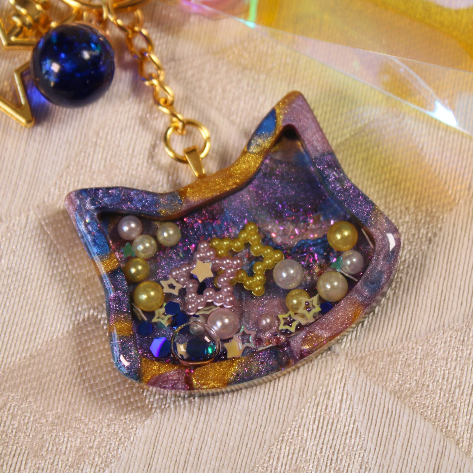 A handmade, resin, shaker-charm keychain in the shape of a cat's head. Inside the cat are free-moving beads, glitter, and charms. The keychain comes with extra charms attached to it, including a strap and star shaped clip, as well.