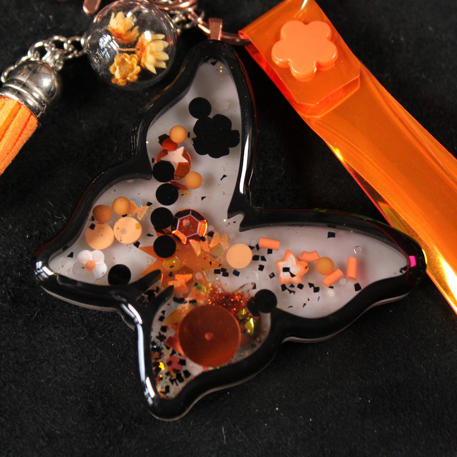 A handmade, resin, shaker-charm keychain in the shape of a butterfly. Inside the butterfly are free-moving beads, glitter, and polymer clay sprinkles suspended in oil. The keychain comes with a variety of extra charms to add to the orange and black floral theme.