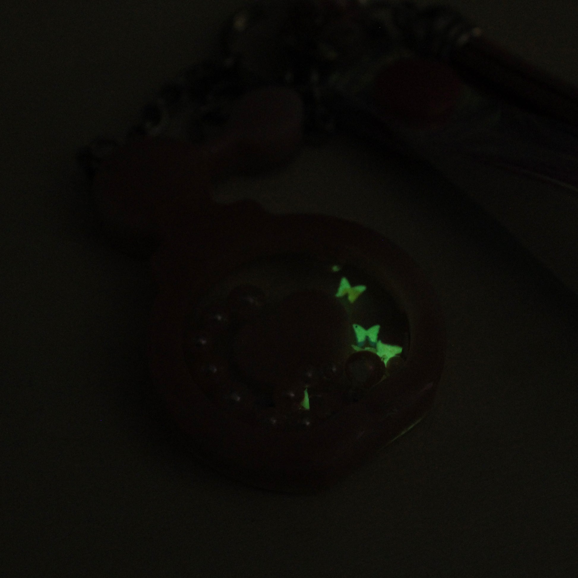 A handmade, resin, shaker-charm keychain in the shape of a perfume bottle. Inside the bottle are free-moving beads and glitter suspended in oil. The keychain comes with a variety of extra charms, such as a glass orb filled with flowers, and an iridescent strap.