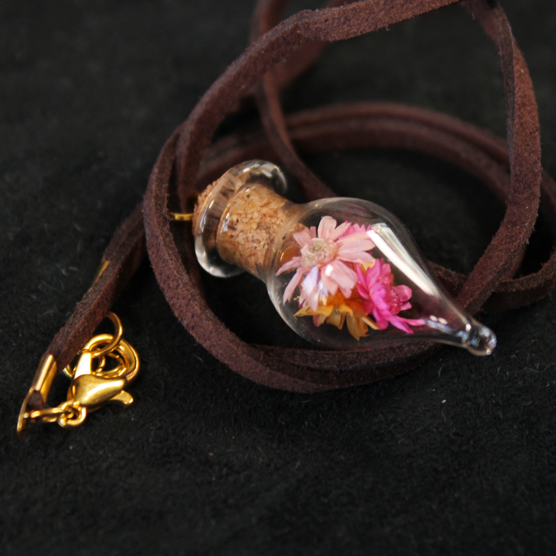 This necklace contains tiny pink and orange flowers in a fun shaped glass bottle. The necklace hangs on a 20in brown cord.