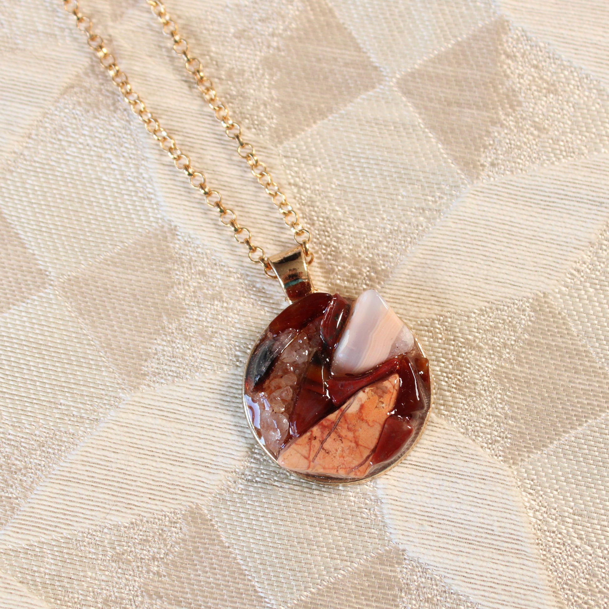 This pendant is made up of multiple small red and pink pieces of stone which have been carefully placed within a circular, pale gold bezel and coated with resin. The necklace hangs on a 22in chain.