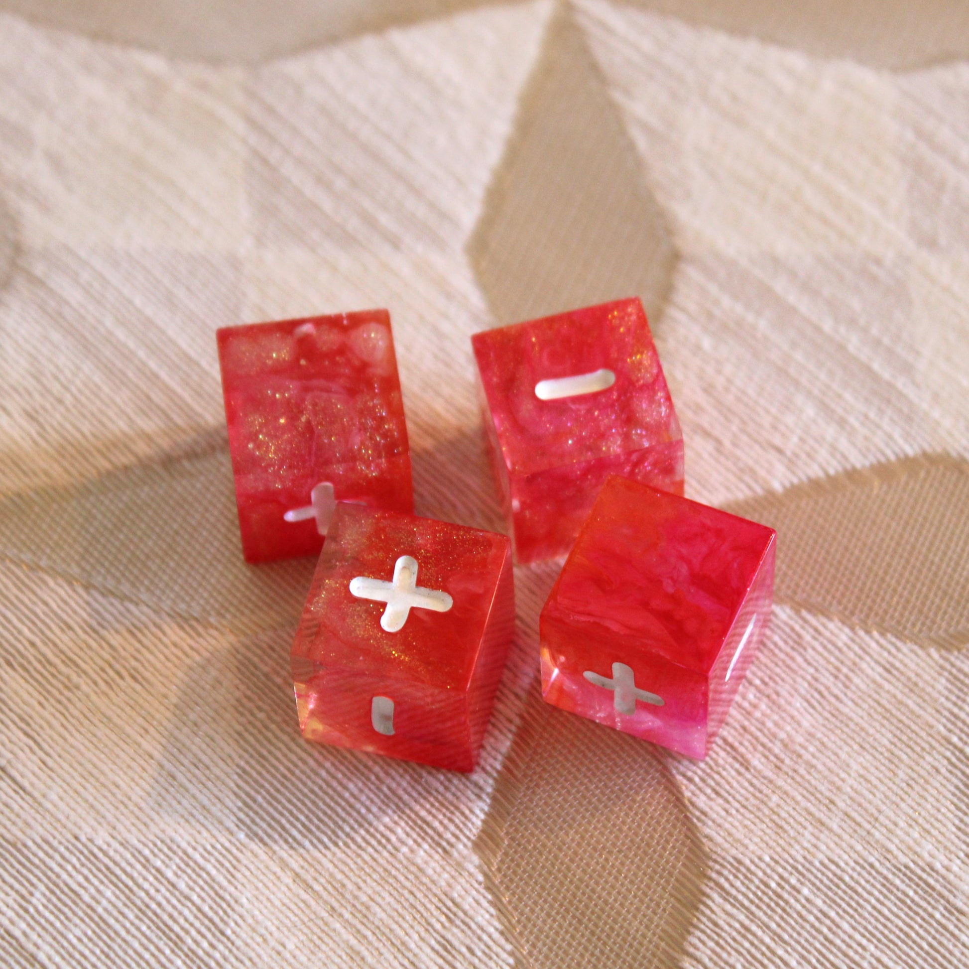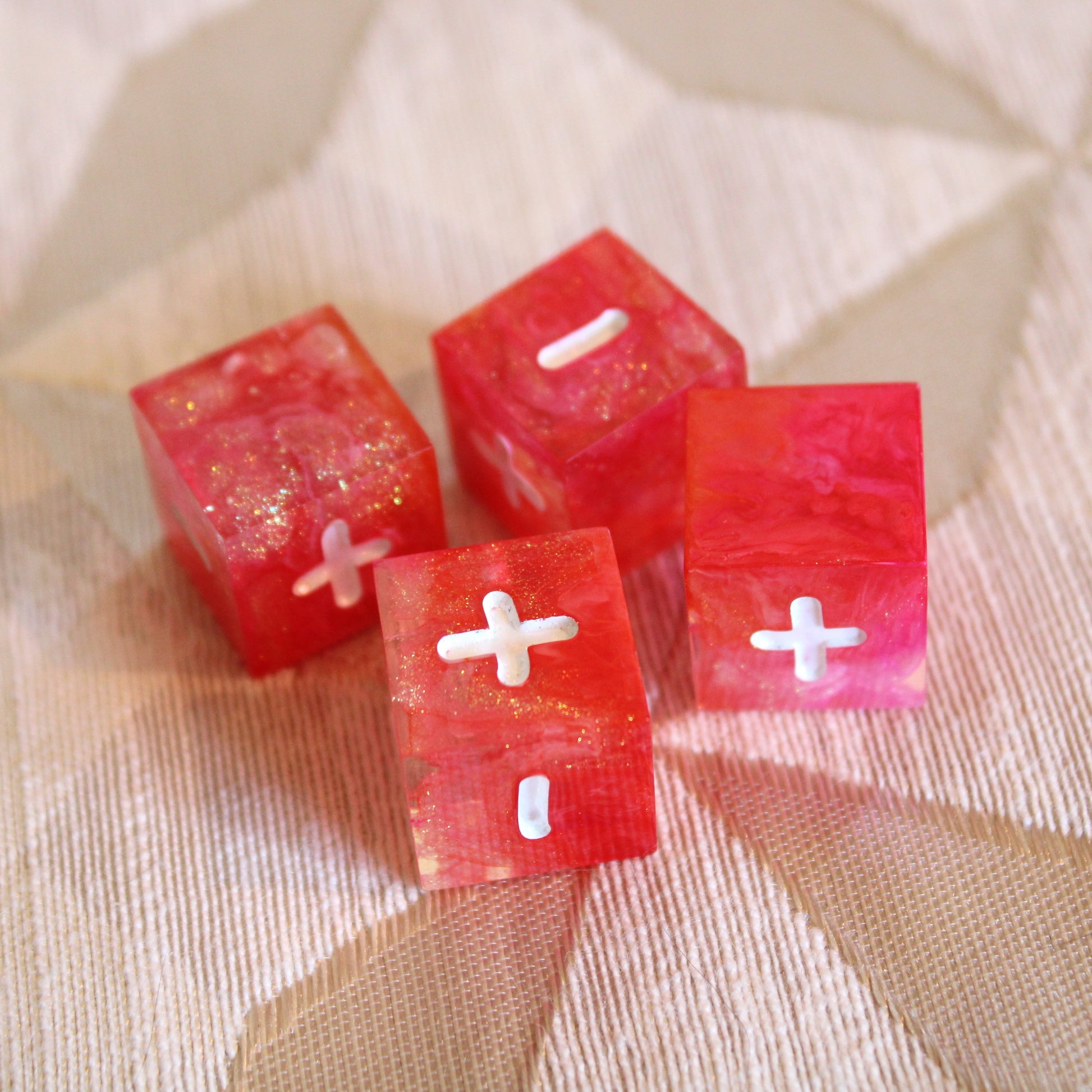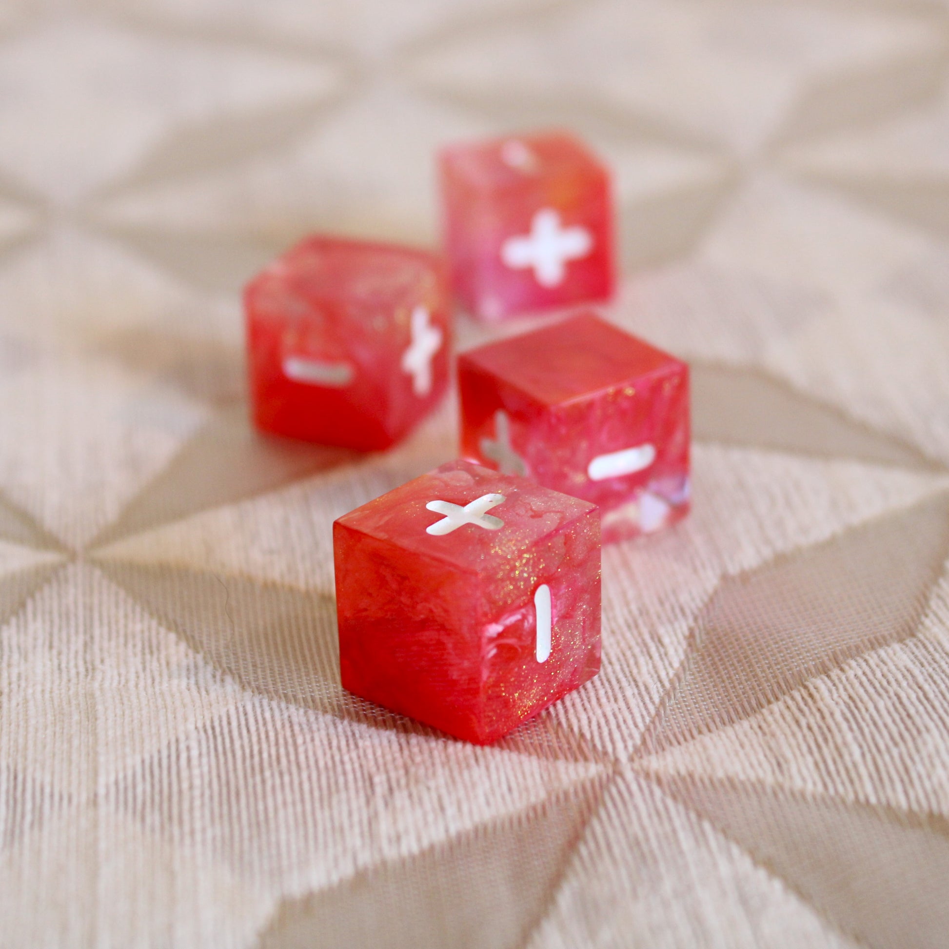 This listing is for a set of four fate/fudge dice (six sided dice with two + signs, two - signs, and two blank sides).