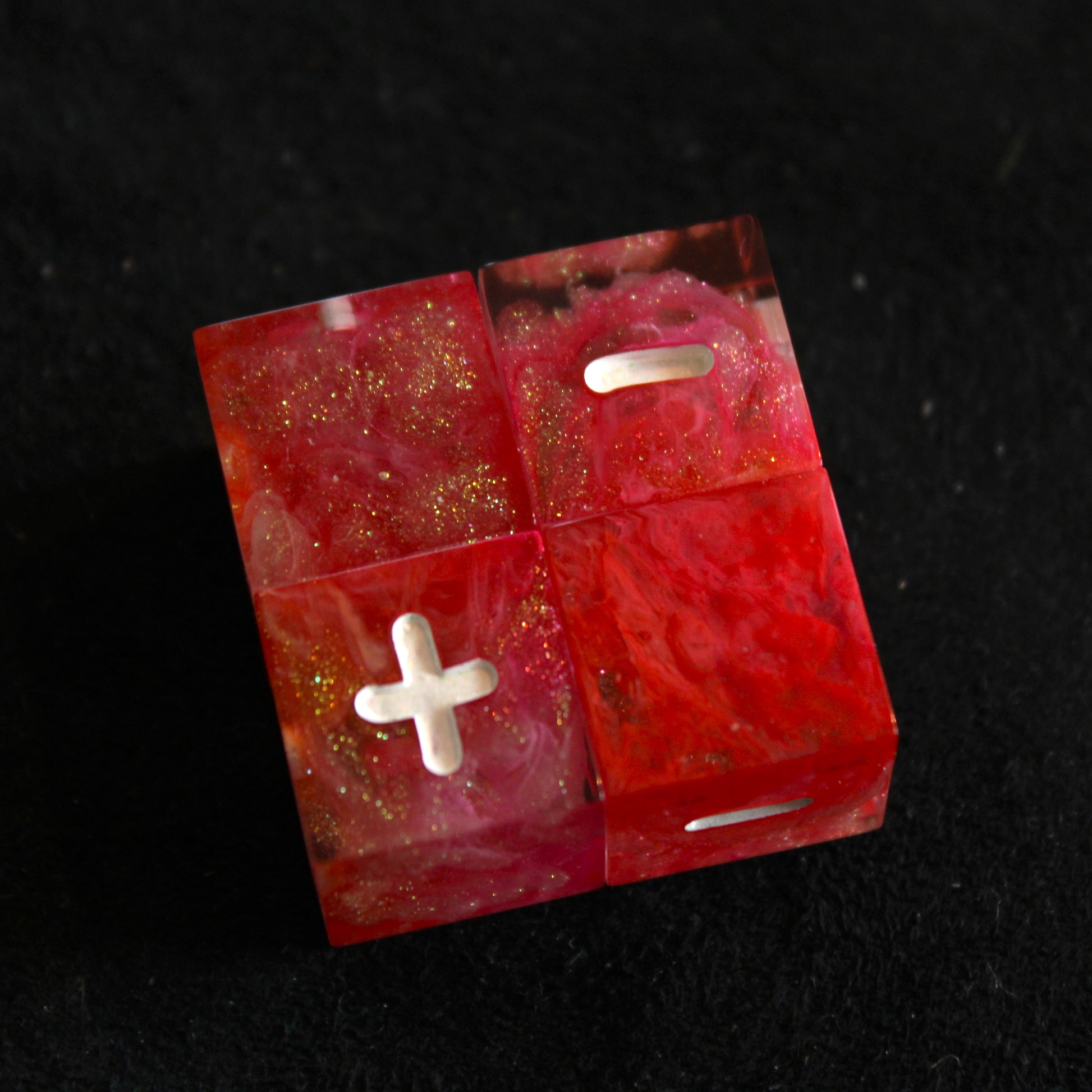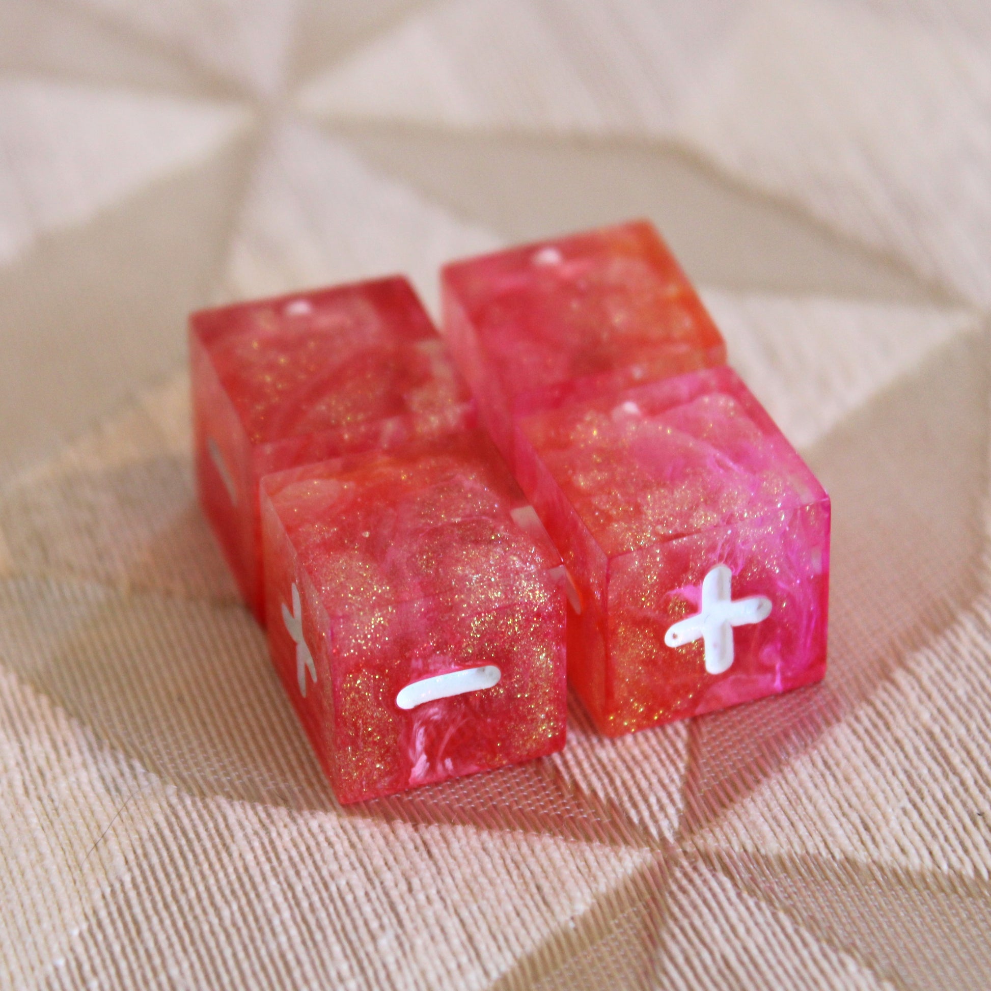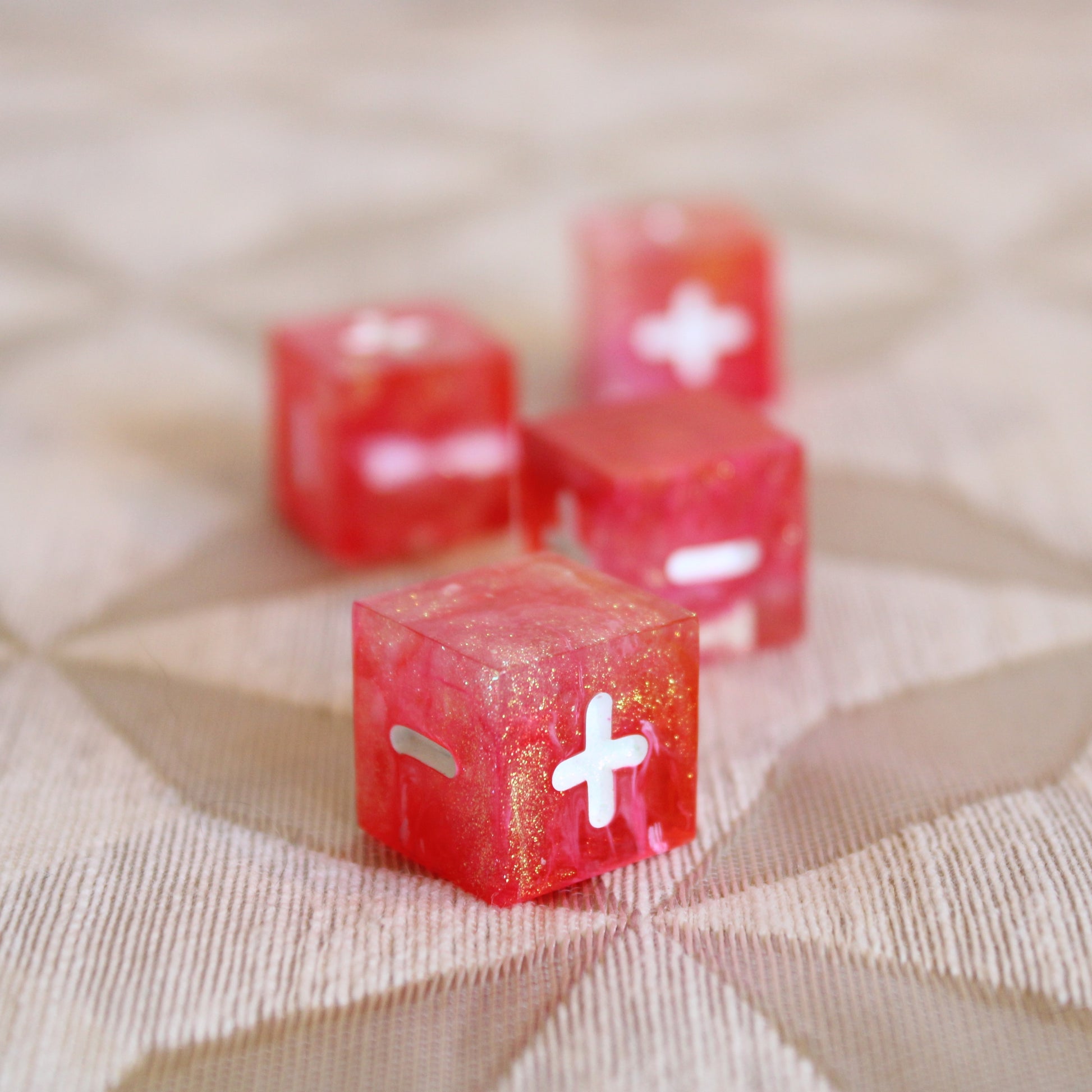 This listing is for a set of four fate/fudge dice (six sided dice with two + signs, two - signs, and two blank sides).