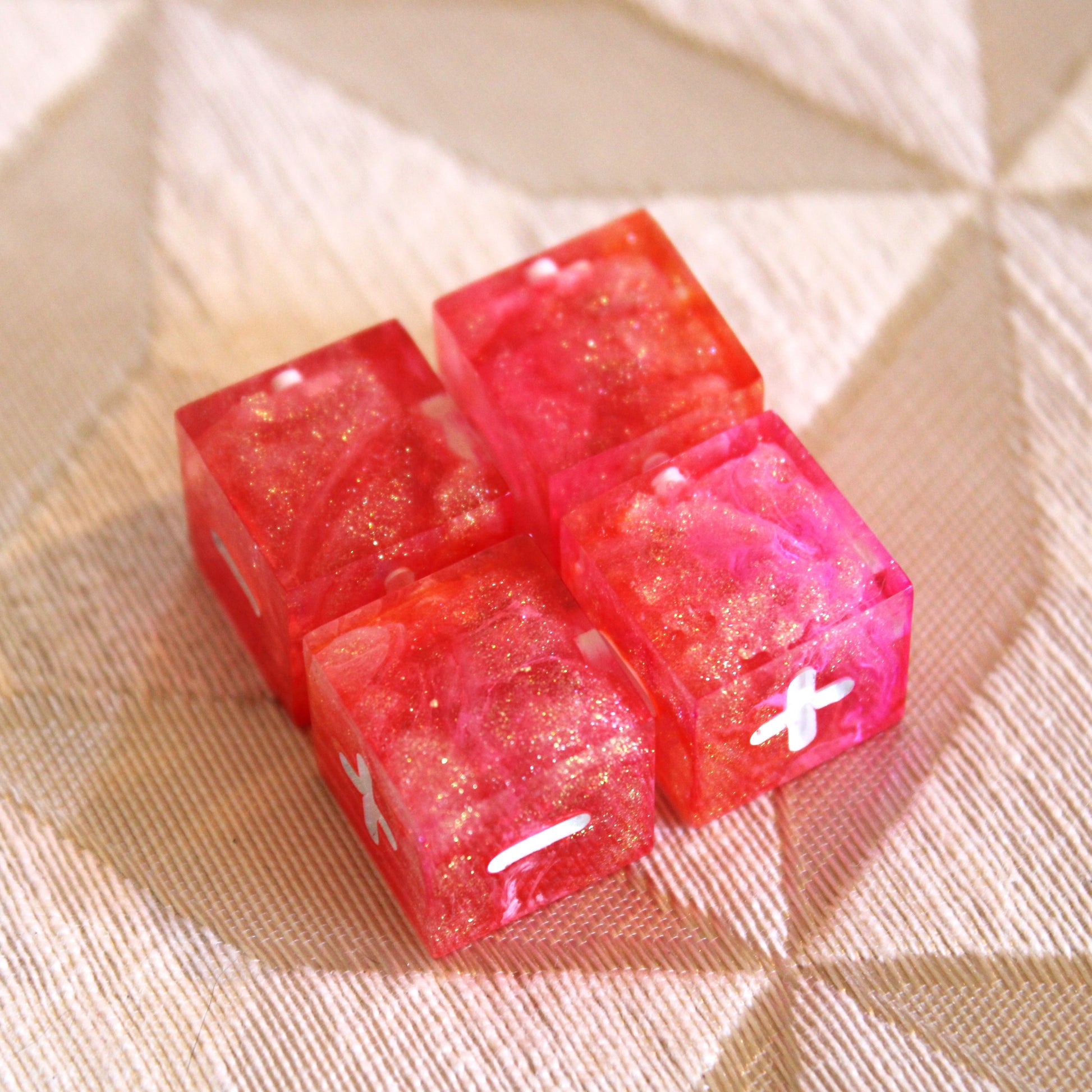 These dice are sparkly! They contain beautiful tones of pink and orange, and shimmer a faint gold. The numbers are white but shimmer a pale pink.