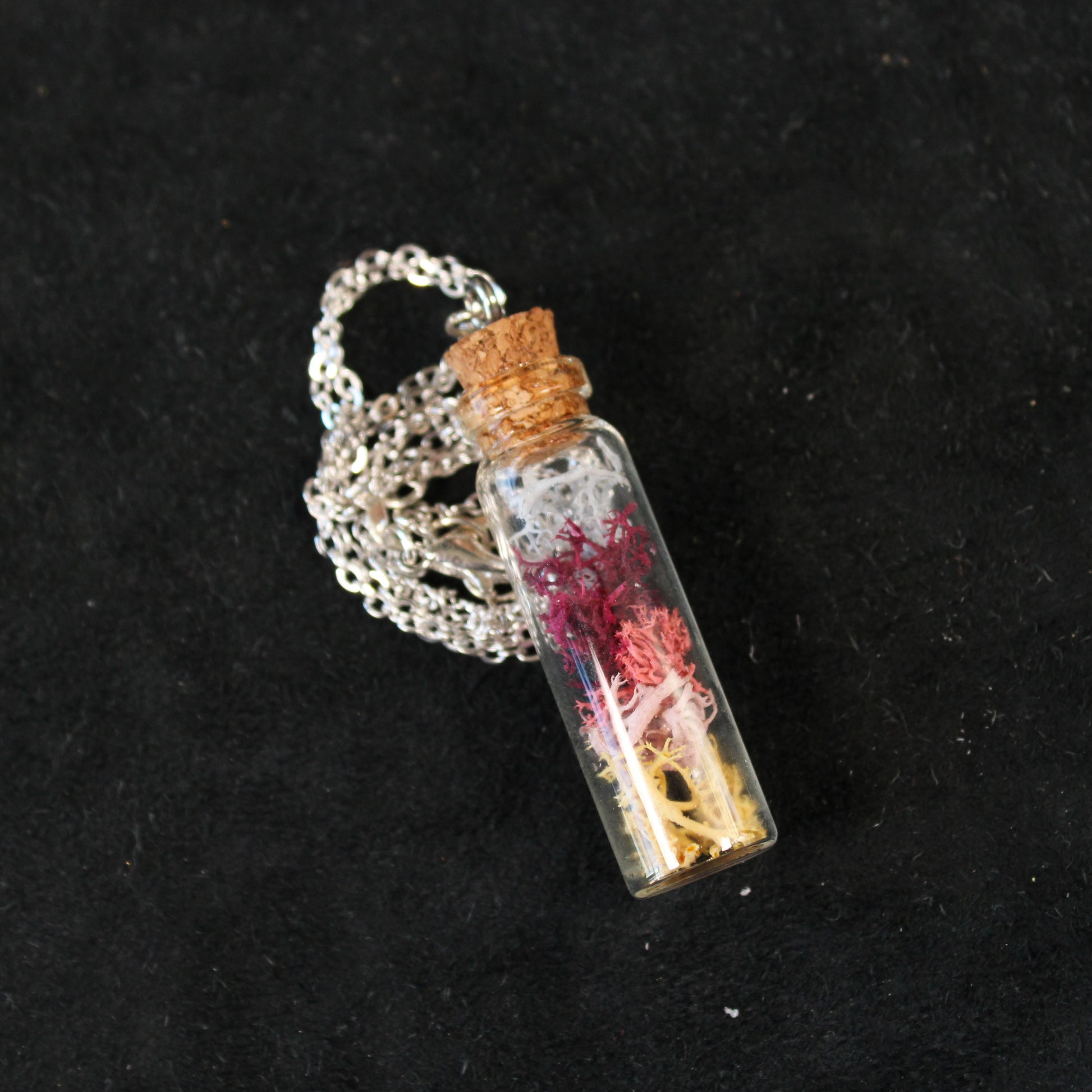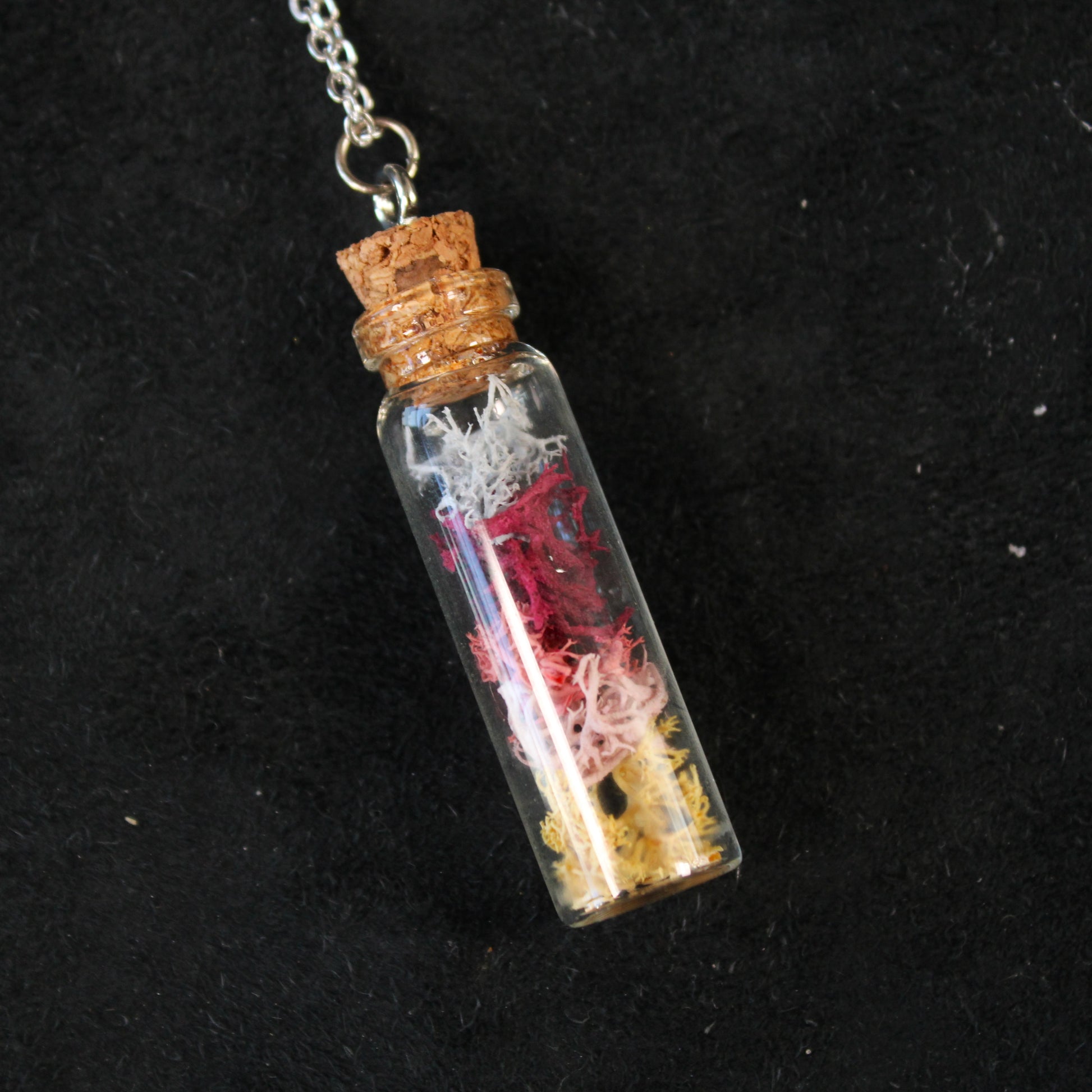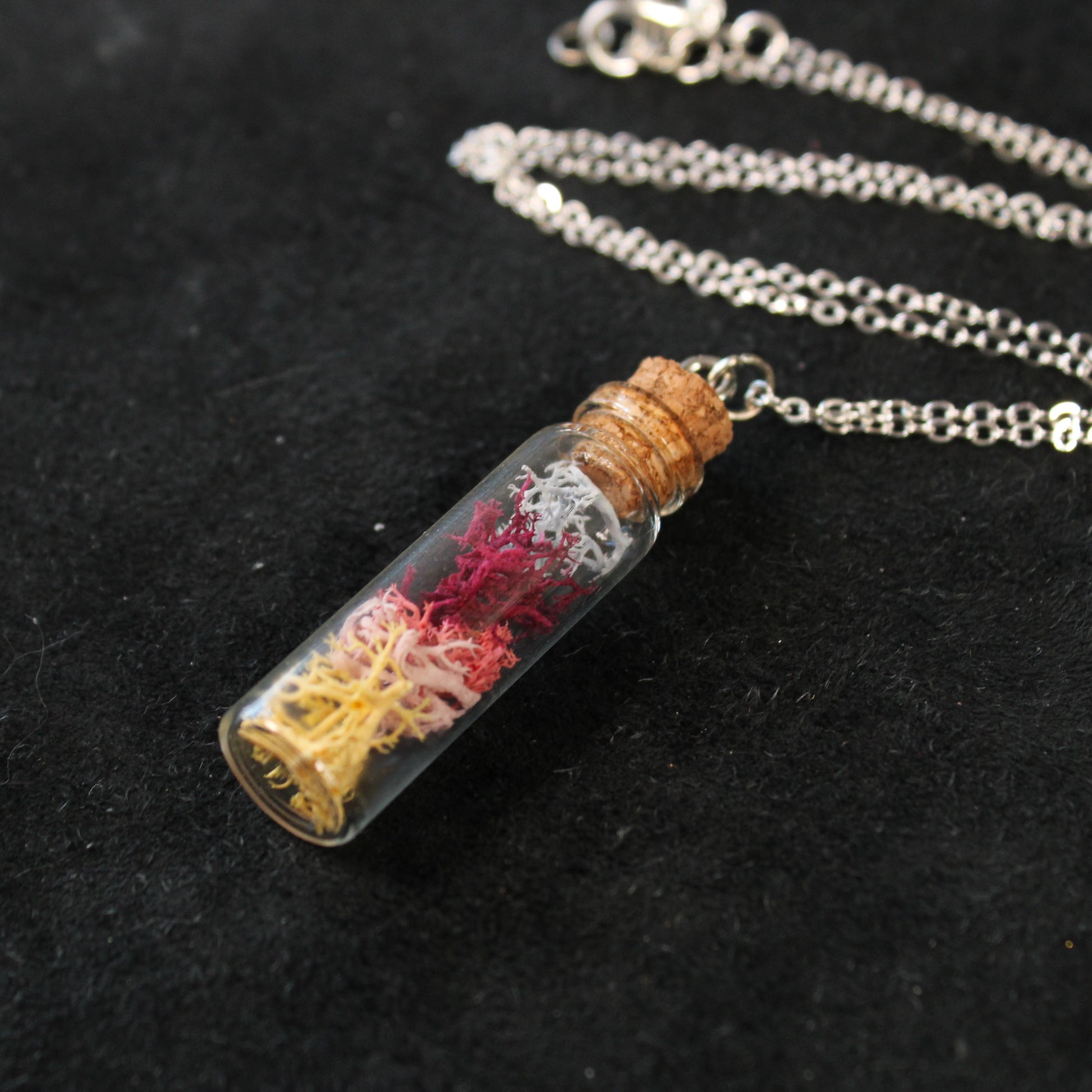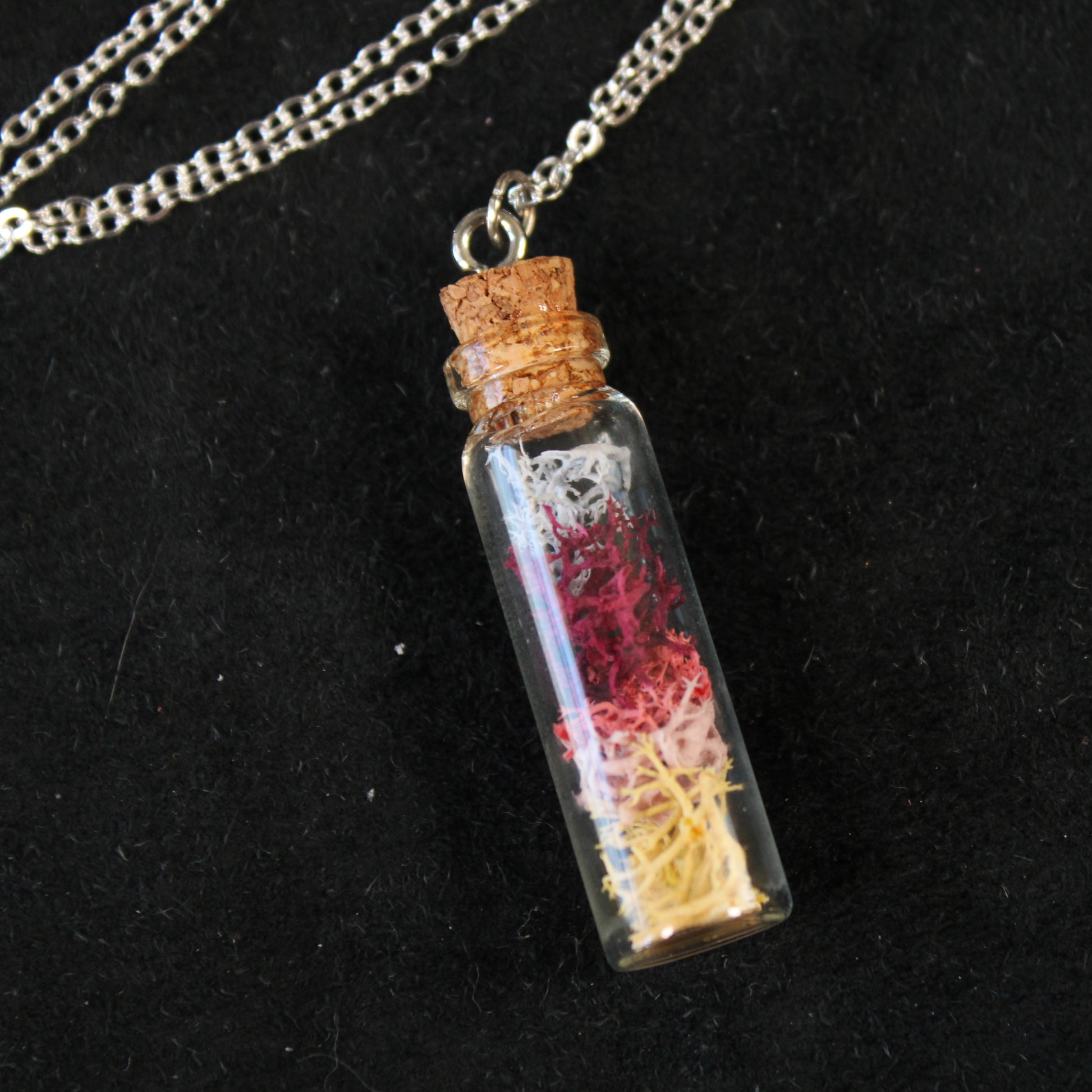 This necklace contains sunrise colored moss in a long glass bottle. The necklace hangs on a 18in chain.