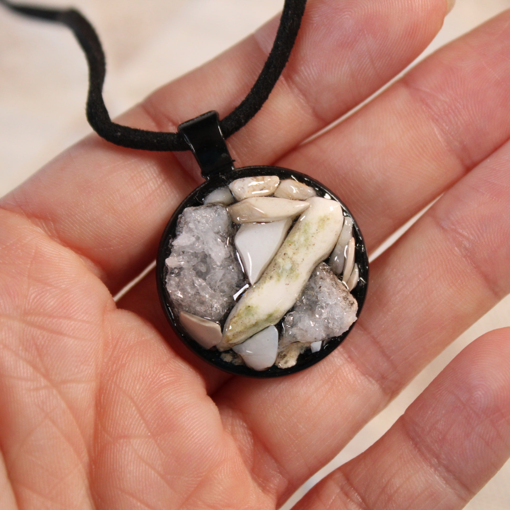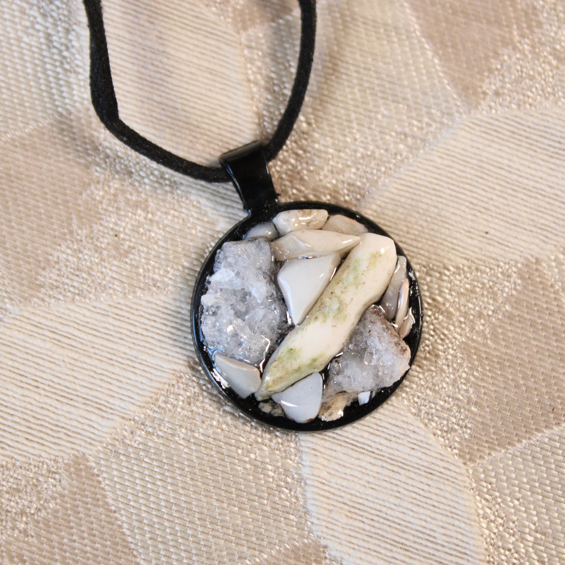 This pendant is made up of multiple small pieces of white stone. The stones have been carefully placed within a circular, black bezel and coated with resin. The necklace hangs on a 20in cord.